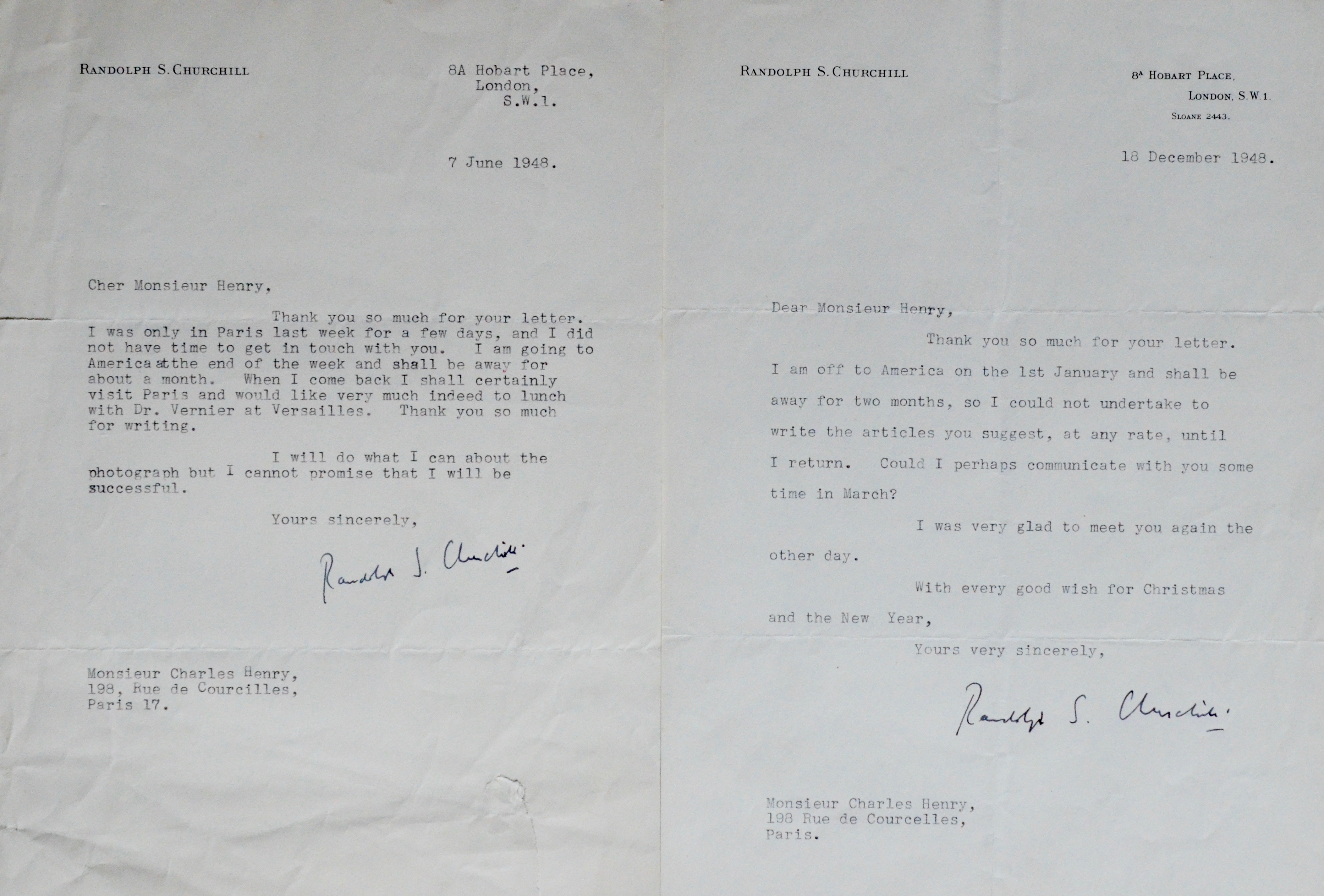 Randolph Churchill n'a pas pu rencontrer Charles Henry lors de son dernier séjour à Paris, mais à son retour d'Amérique, il serait heureux de le voir, de rencontrer M. Vernier à Versailles et d'écrire un article pour lui.