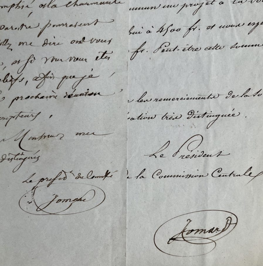 Dans une première lettre, Jomard informe Datan qu'il a été choisi par la Société de Géographie pour sculpter le monument (Gau étant chargé de la partie architecturale). «La souscription s'élève aujourd'hui à 4500 fr. et nous espérons qu'elle atteindra le chiffre de 6000 fr. Peut-être cette somme s'élèvera-t-elle plus haut». Puis dans une seconde lettre il lui soumet de la documentation iconographique. «Vous avez mis à profit, pour votre buste du contre-amiral d'Urville, celui que possède Mr Dumontier, et vous ne pouviez mieux faire. Cependant le beau portrait lithographié, et la charmante réduction qui vient de paraître, pourraient aussi vous aider; veuillez me dire où en est votre travail, et si vous vous êtes occupé aussi des bas-reliefs, afin que je pusse en parler à la prochaine réunion du Comité des souscripteurs. Je serais bien aise de causer avec vous […]».