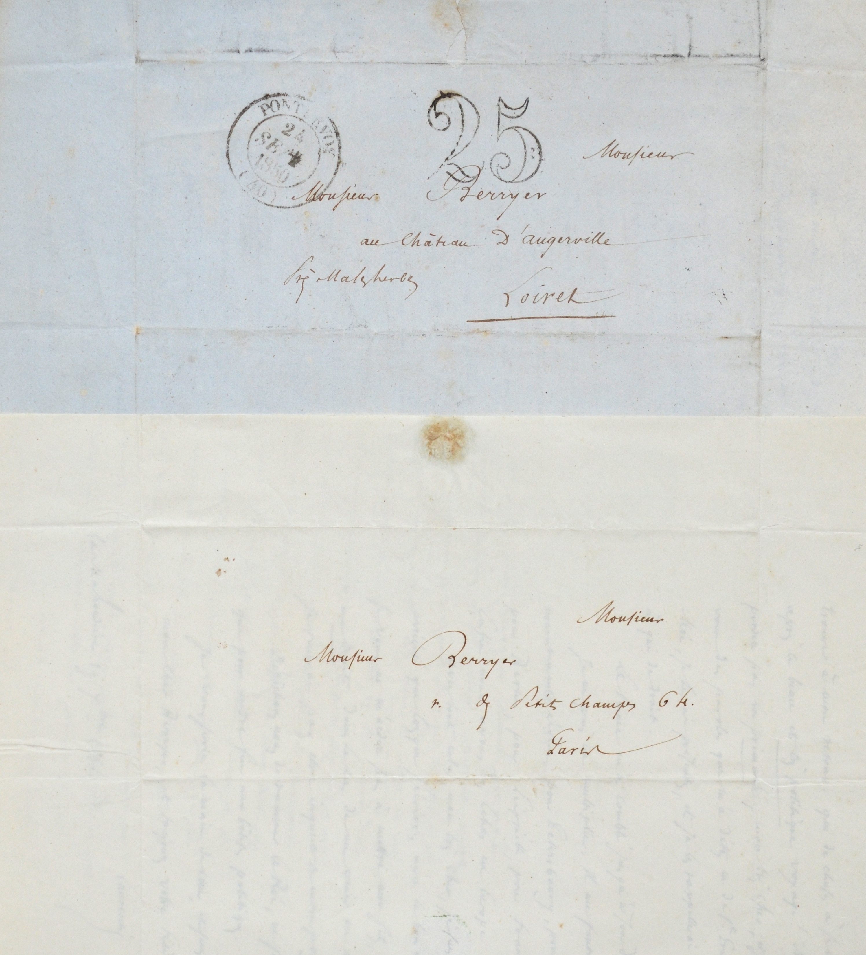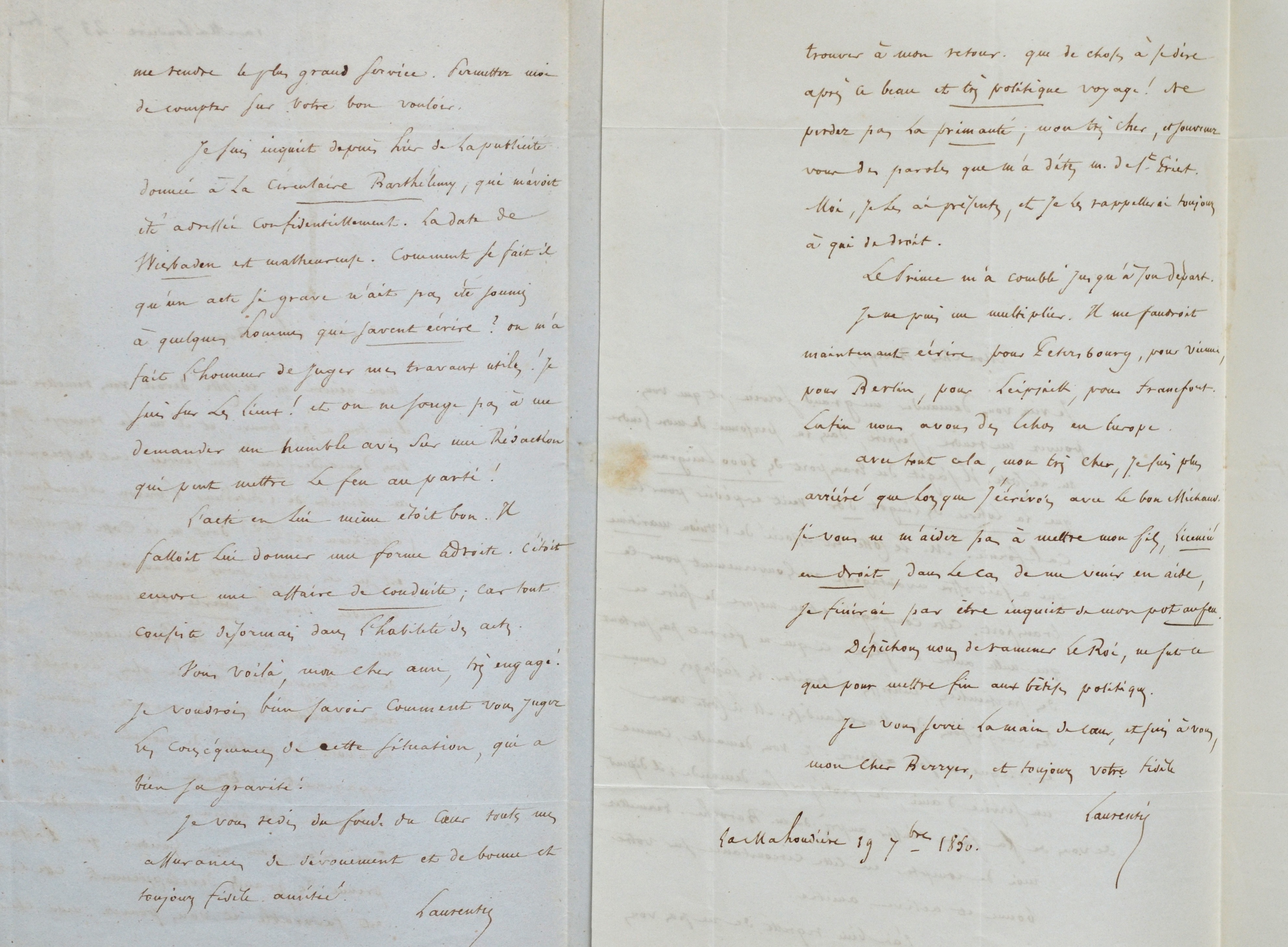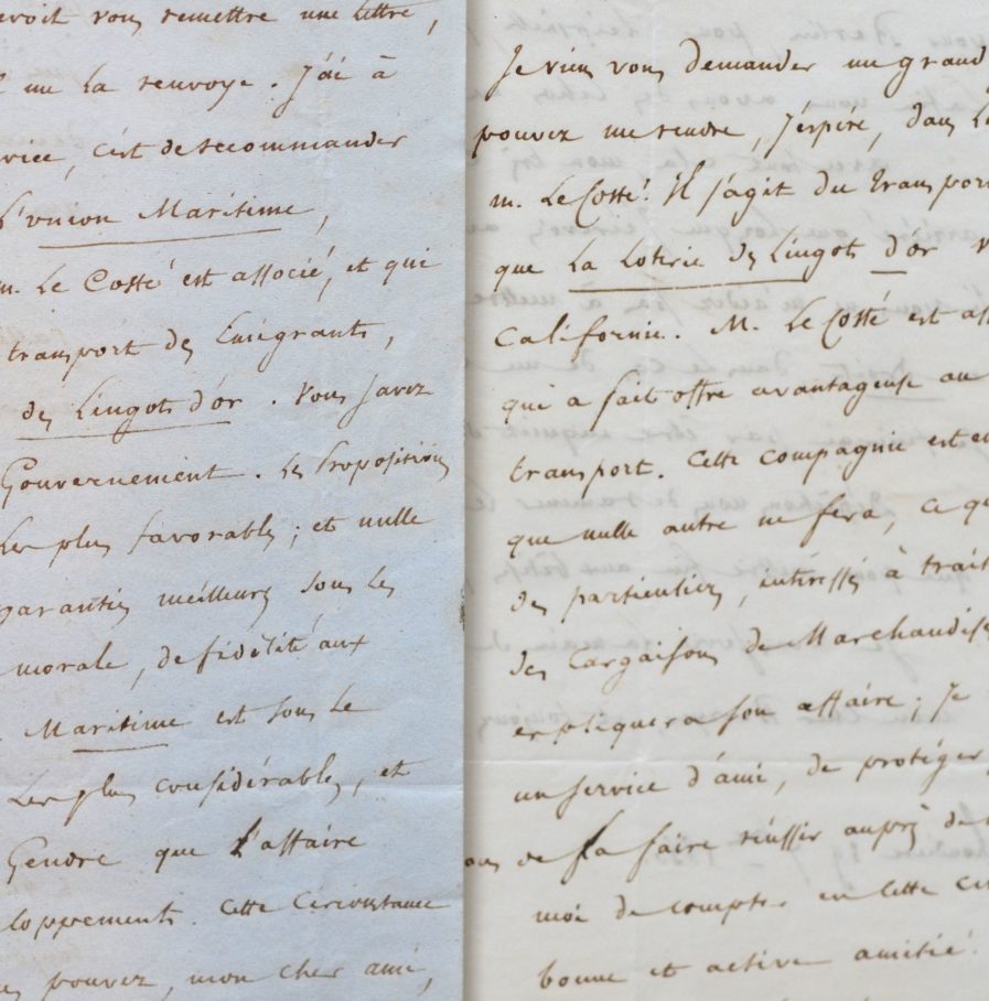 Pierre-Sébastien Laurentie (Le Houga, 1793/1876)Deux lettres de Pierre-Sébastien Laurentie à Berryer, relatives au transport de 5000 émigrants parisiens vers la Californie à l'époque de la ruée vers l'or. [La "loterie des lingots d'or" était une célèbre loterie à vocation politique organisée par la "Société des lingots d'or", société créée par décret le 3 août 1850 ; elle avait pour vocation de convoyer 5 000 ouvriers sans travail en Californie, pour profiter de la ruée ver le nouvel Eldorado. Mais loterie s'est avérée plus tard être truquée (le lingot n'ayant en réalité aucune chance d'être gagné)]. Par ces lettres, Laurentie souhaite que Berryer intervienne auprès du ministre de l'Intérieur pour favoriser la société L'Union Maritime - dans laquelle son gendre a des intérêts, pour l'attribution du marché. "Il s'agit du transport des 5,000 émigrants que La Loterie des Lingots d'or veut expédier pour la Californie. M. Le Cotté est associé de l'Union maritime qui a fait offre avantageuse au Gouvernement pour ce transport. Cette compagnie est en mesure de faire ce que nulle autre ne fera, ce que ne feront pas surtout des particuliers, intéressés à traiter les passagers comme des cargaisons de marchandises [...]. Vous savez que c'est une affaire de Gouvernement. Les propositions de la compagnie sont les plus favorables ; et nulle autre d'ailleurs n'offre des garanties meilleures sous le rapport de probité, de morale, de fidélité aux engagements. L'Union Maritime est sous le patronage des hommes les plus considérables, et j'ai besoin pour mon gendre que l'affaire prenne de grands développements [...]".