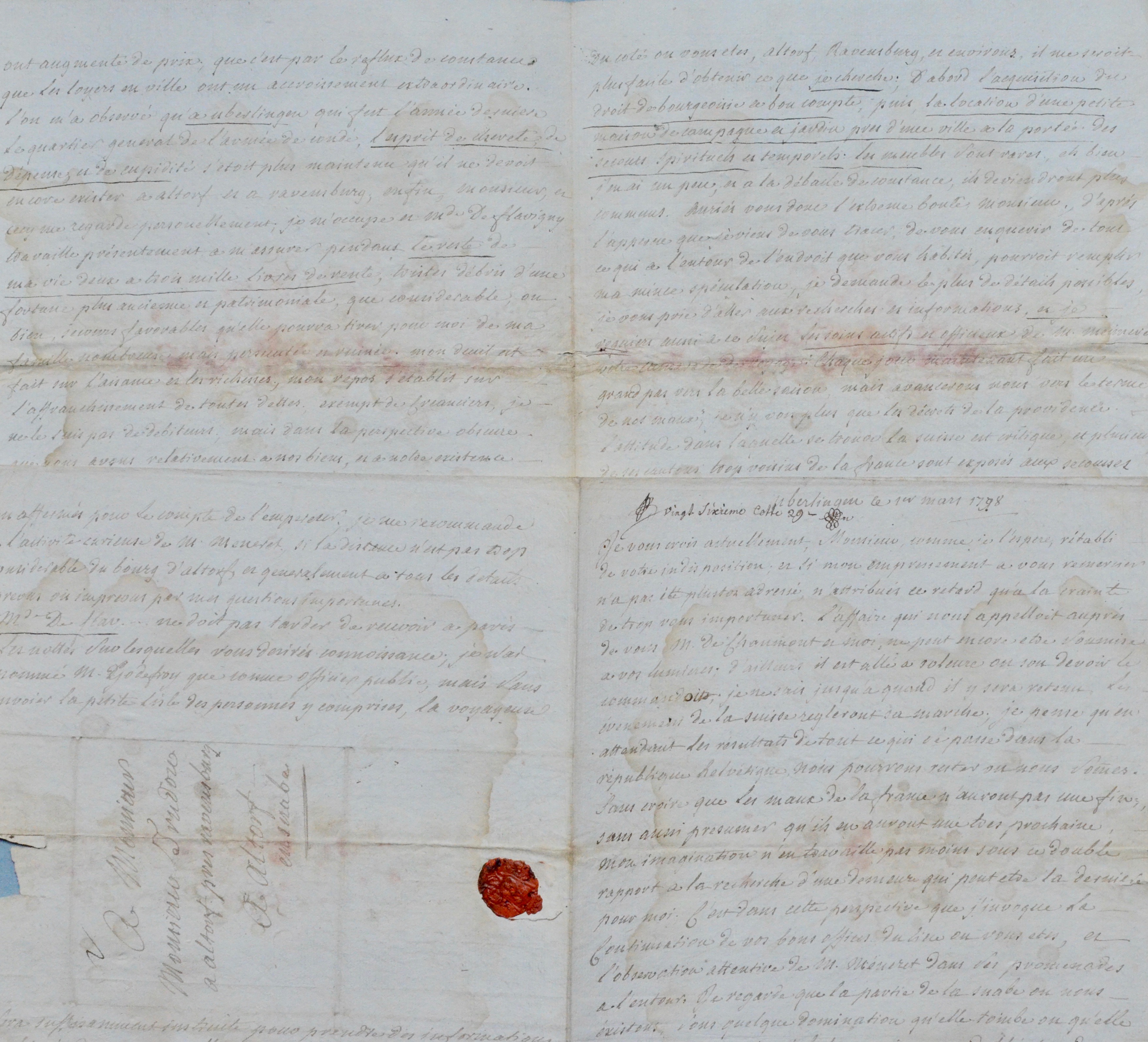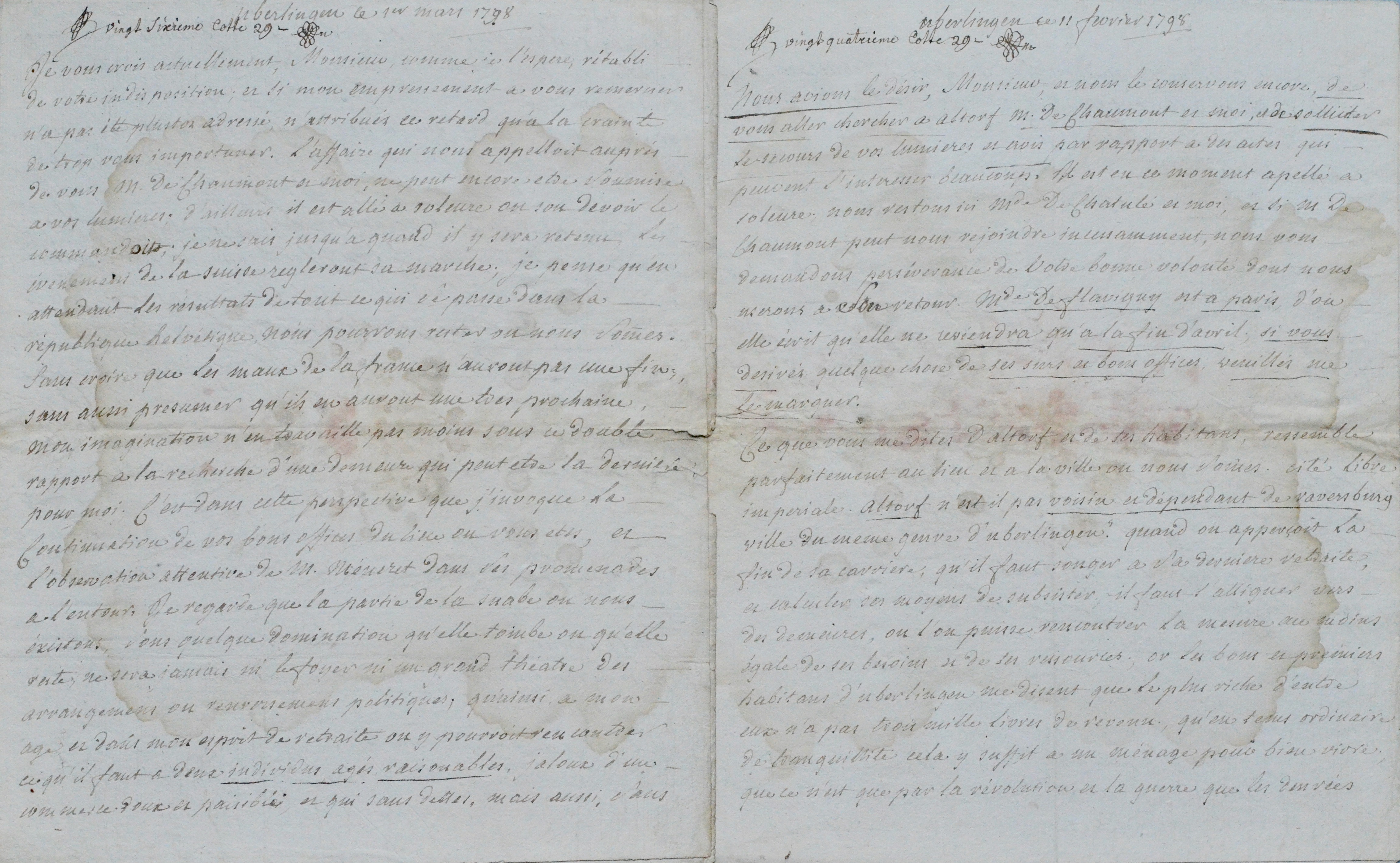 Il détaille sa situation et celle de sa famille « persécutée et ruinée » : « Mon deuil est fait sur l'aisance et les richesses ; mon repos s'établit sur l'affranchissement de toutes dettes […] ». Il cherche un asile en Suisse ou en Allemagne et démarche son ami pour qu'il lui trouve « une demeure qui peut être sera la dernière pour moi ». Il passe en revue plusieurs villes et régions, etc.