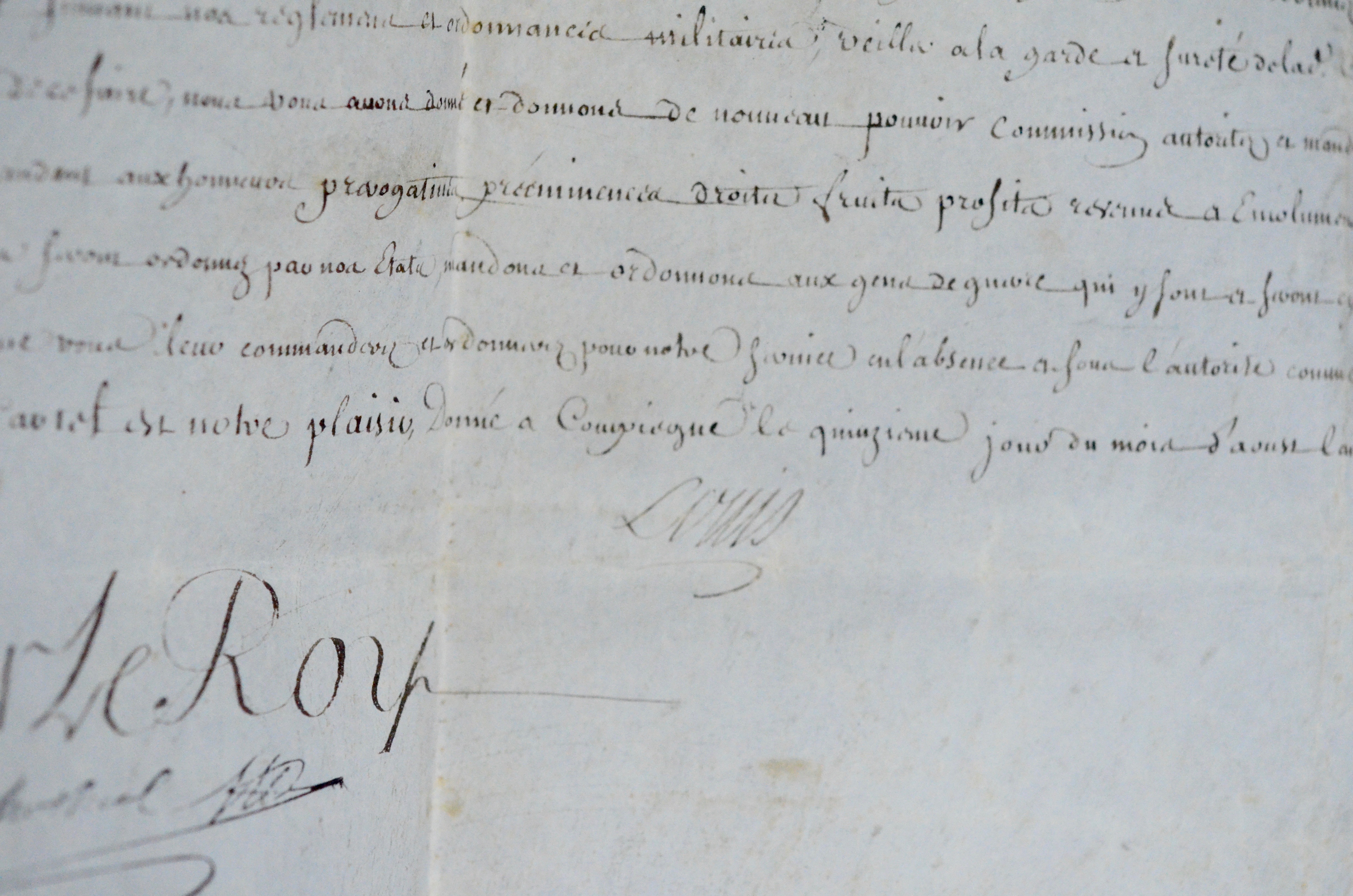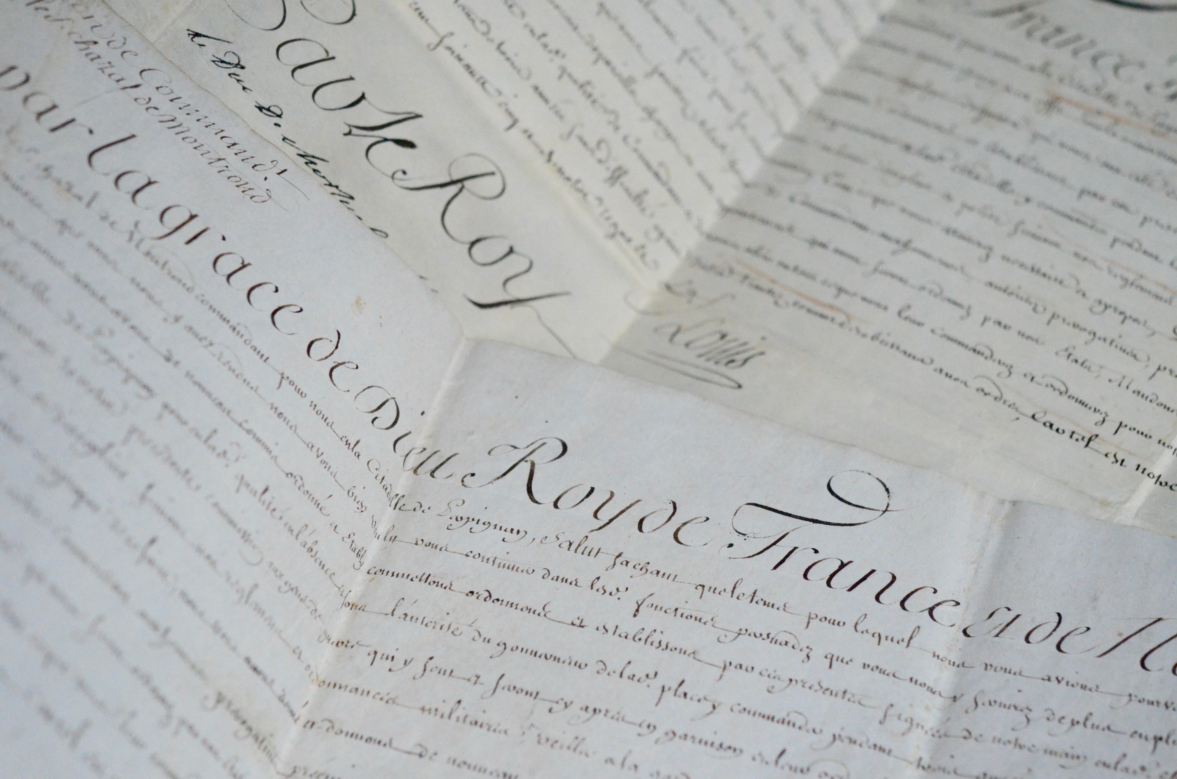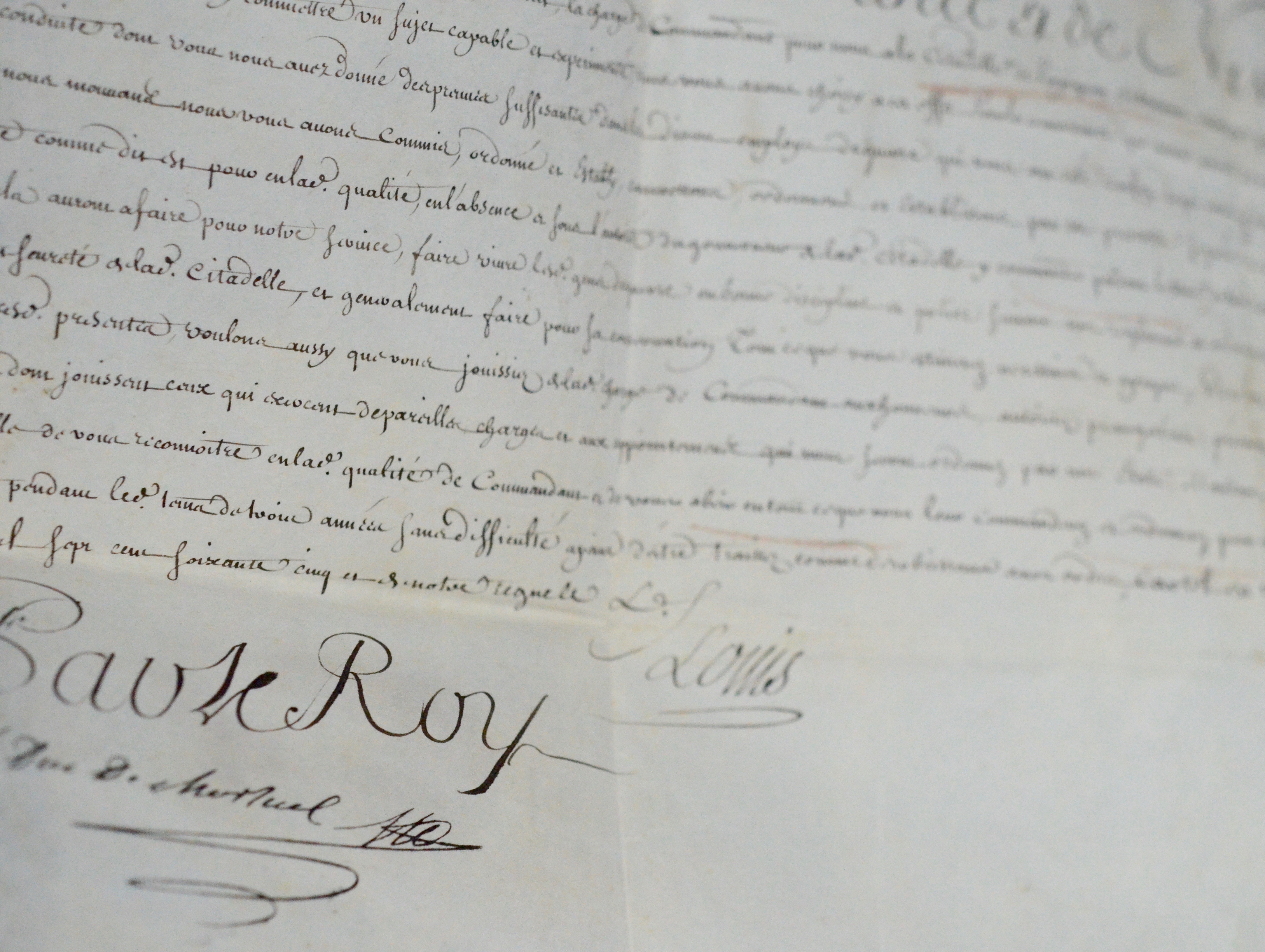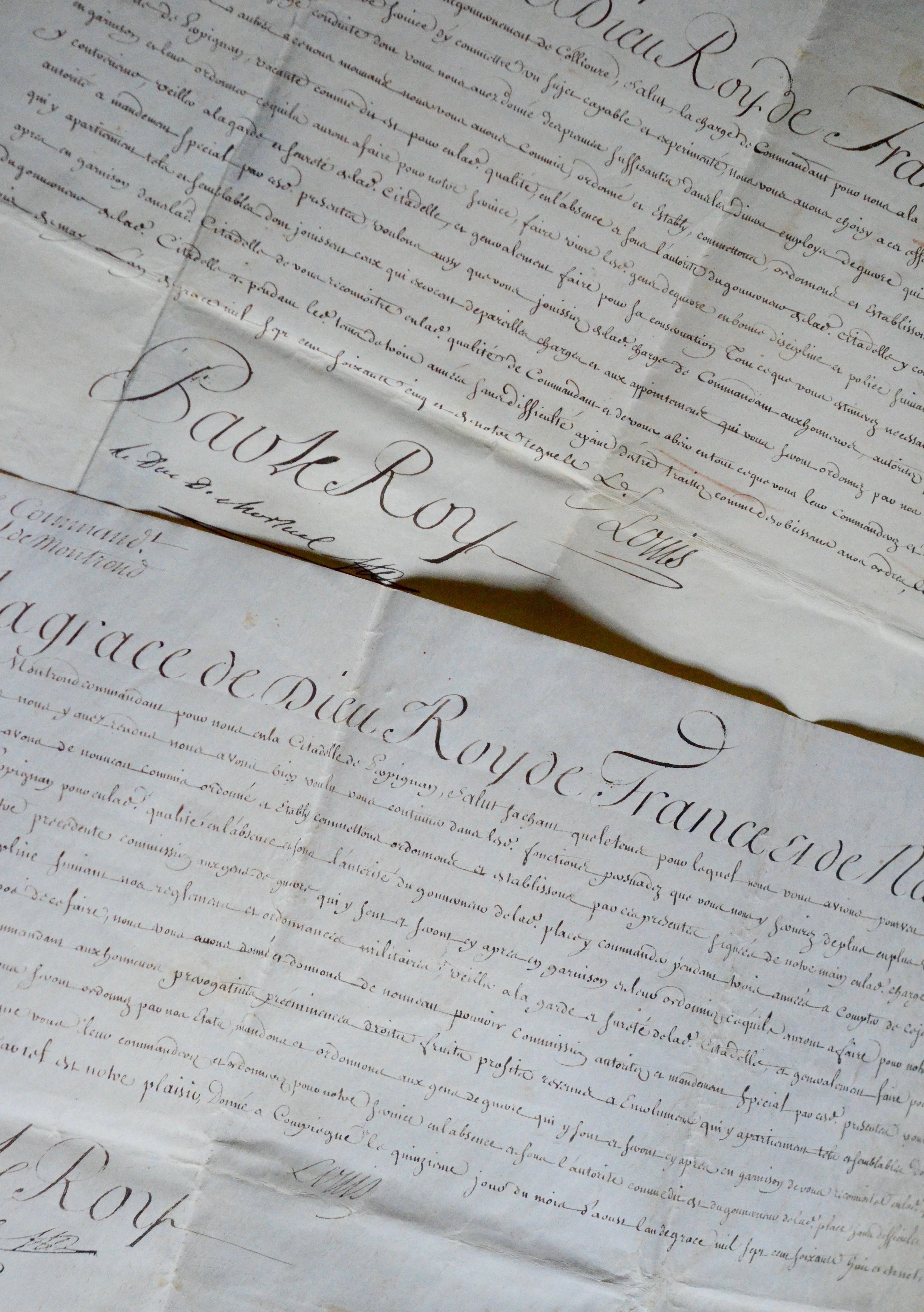 Commission de commandant de la citadelle de Perpignan pour le sieur Chazal de Montrond (1765) et renouvellement de la même charge (1768). Précisons sur sa mission  : "y commander pendant le temps de trois années aux gens de guerre qui y sont et seront cy après en garnison et leur ordonner ce qu'ils auront à faire pour notre service, faire vivre lesdits gens de guerre en bonne discipline et police suivant nos règelments et ordonnances militaires, faire sévèrement chatier ceux qui oseront y contrevenir, veiller à la garde et sureté de la dite citadelle, et généralement faire pour sa conservation tout ce que vous estimerez nécessaire et à propos [...]".