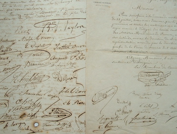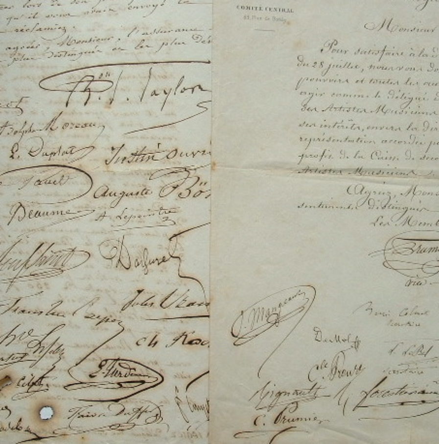 Deux lettres sous forme de pétitions, signées par les membres de l'Association des Artistes Musiciens et de l'Association des Lettres et des Arts, en faveur de l'organisation de soirées théâtrales à Alger et d'une "loterie de bienfaisance du Vase d'Argent," au profit des caisses de secours des deux associations. La première porte 12 signatures (Panseron, Truliers, Le Bel, Forestier aîné, etc.), la seconde en porte 29 (baron Taylor, Justin Ouvrié, Lapito, Picot, Ad. Moreau, etc.).