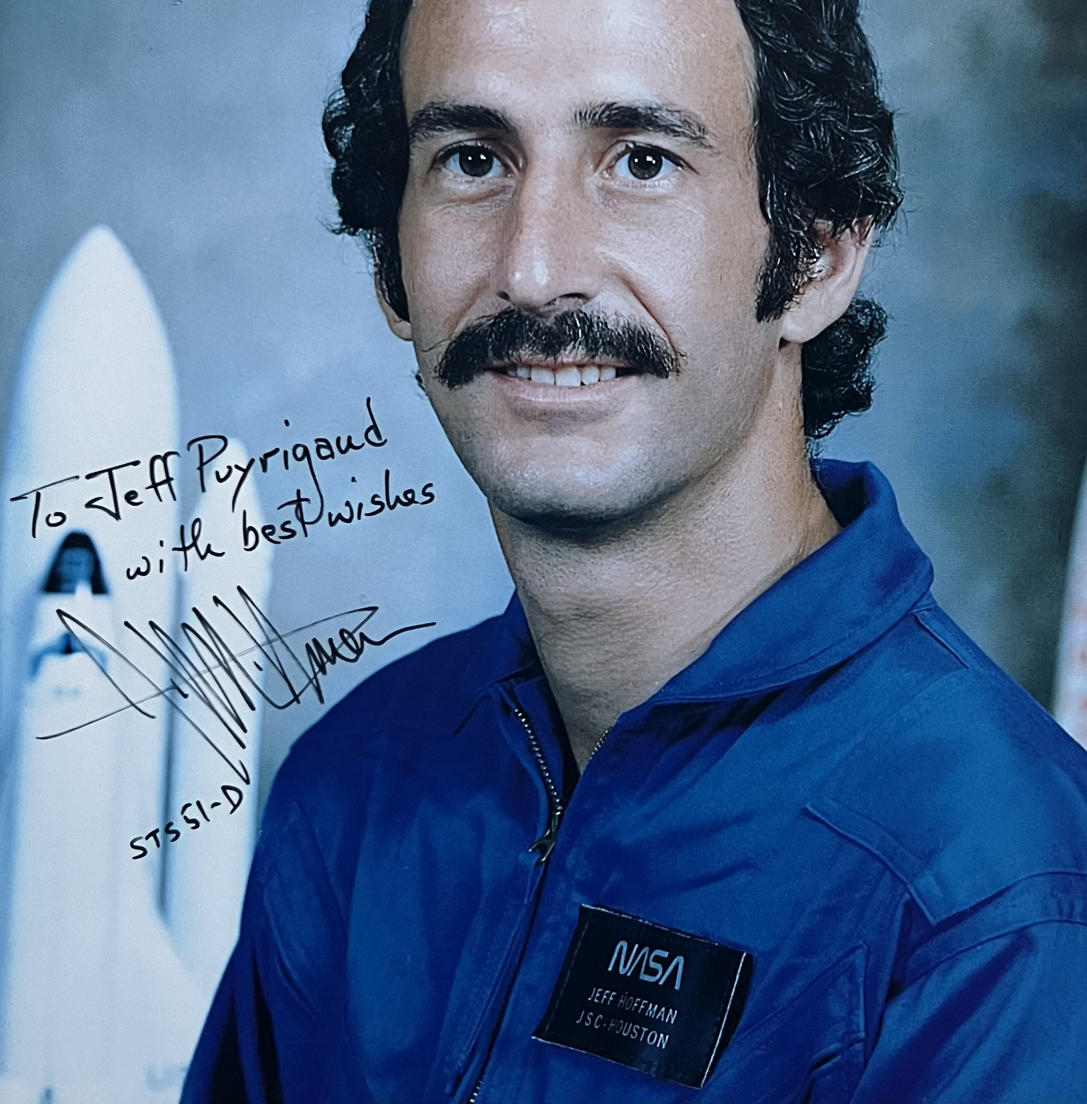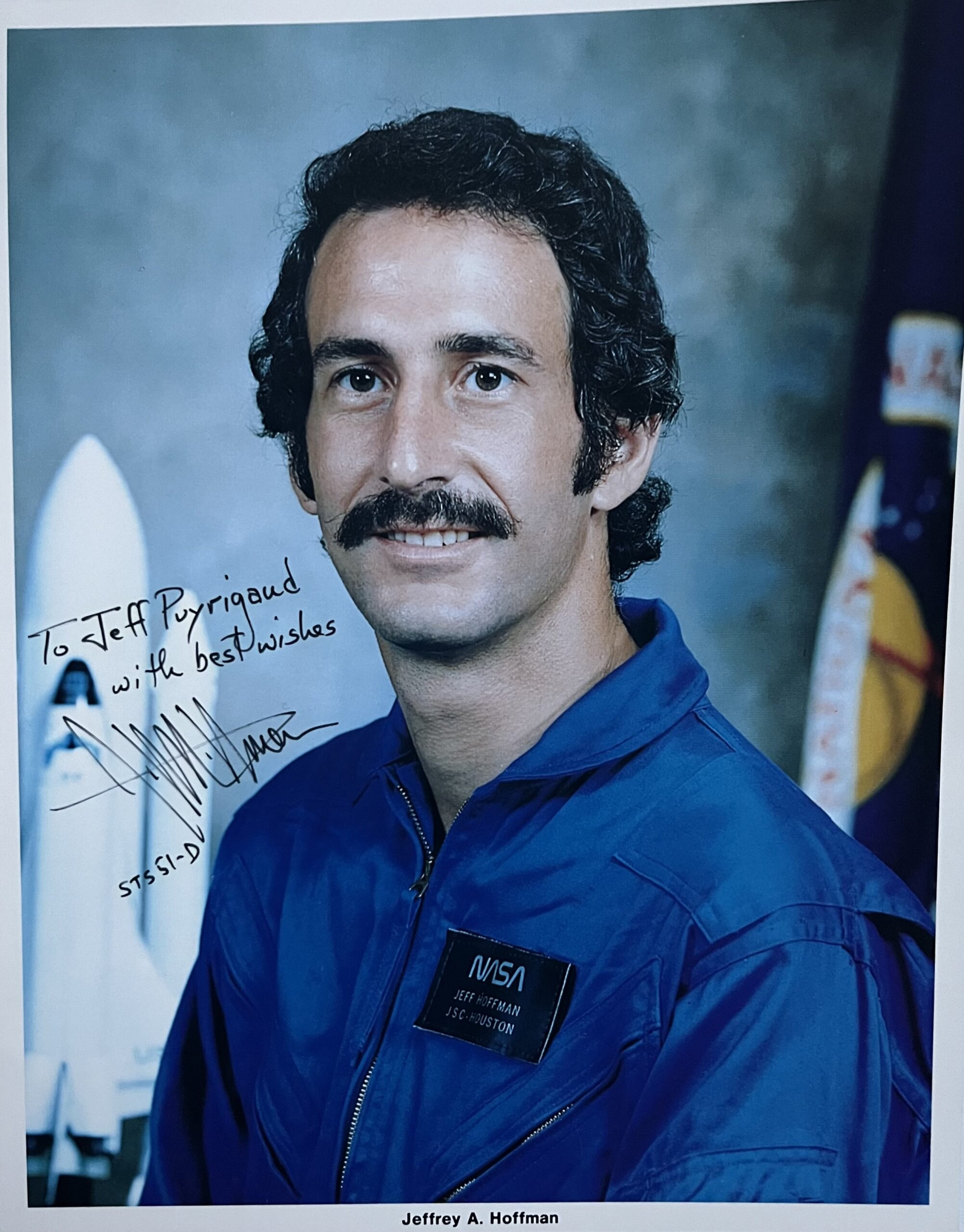 - Portrait imprimé de Jeffrey A. Hoffman (cliché NASA), en buste, lors de la mission STS-51-D (Discovery, avril 1985), portant une dédicace : "To Jeff Puyrigaud with best wishes Jeffrey A. Hoffman STS 51-D".