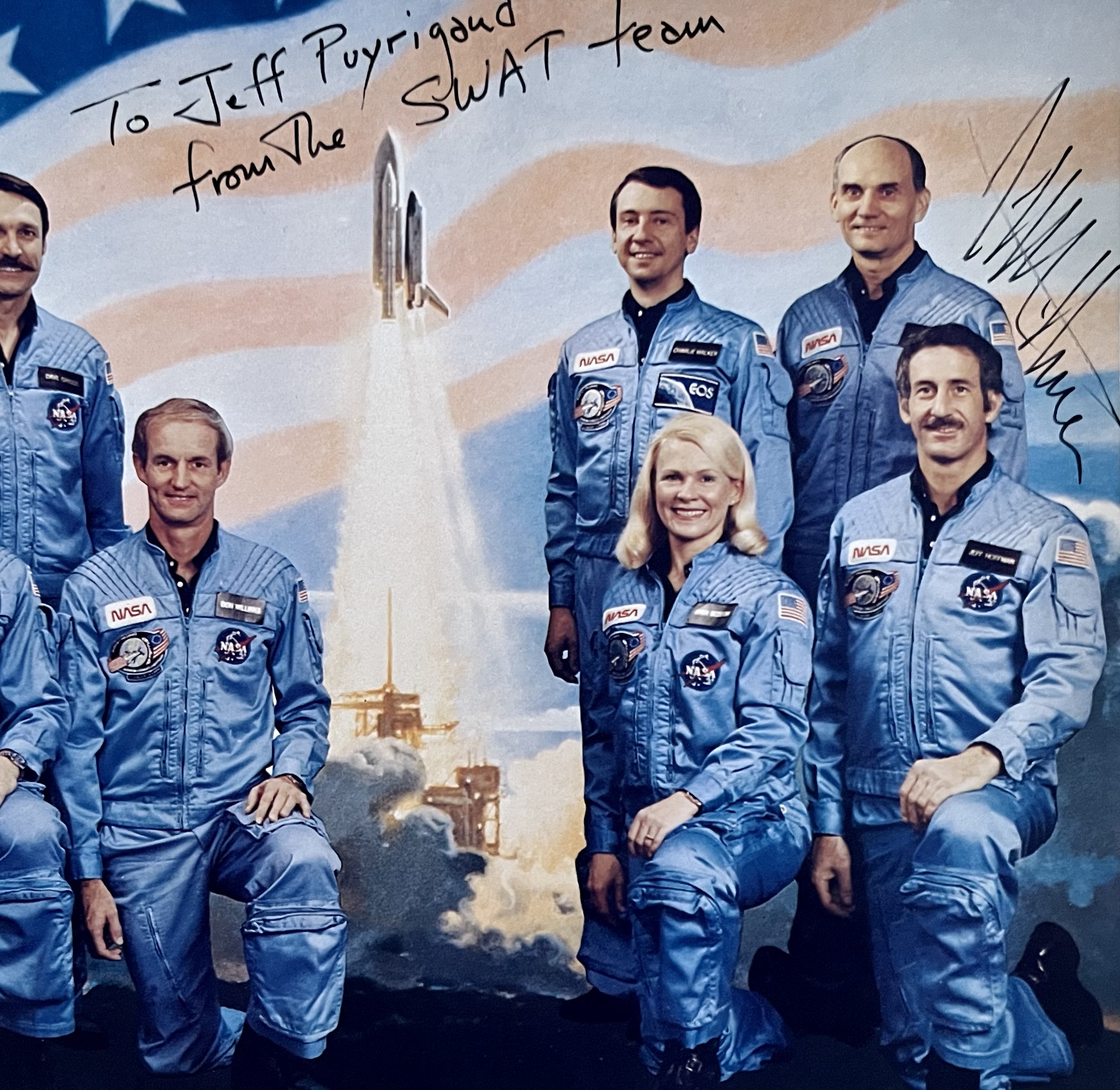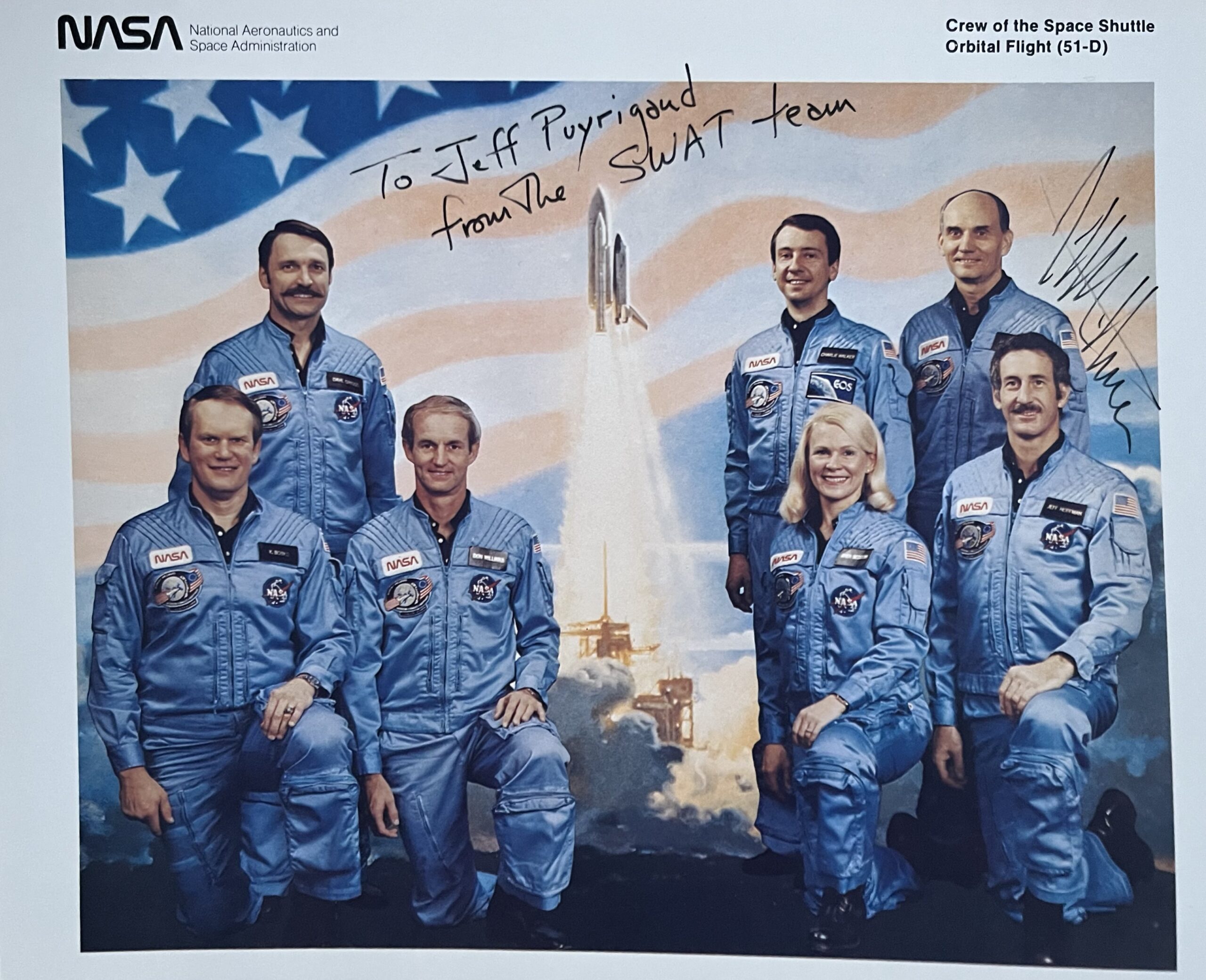 - Portrait de groupe (cliché NASA, imprimé) des 7 membres de la mission spatiale 51-D, portant une dédicace de Jeffrey A. Hoffman : "To Jeff Puyrigaud from the SWAT team".