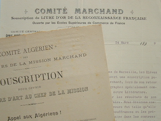 Deux circulaires de souscription à la gloire de la mission Marchand stoppée à Fachoda. L'une ouverte à Alger : "Comité algérien des admirateurs de la mission Marchand. Souscription pour offrir une oeuvre d'art au chef de la mission" (souscription vierge) ; l'autre à Marseille : "Comité Marchand. Souscription du Livre d'or de la reconnaissance française, ouverte par les Ecoles supérieures de commerce de France".
