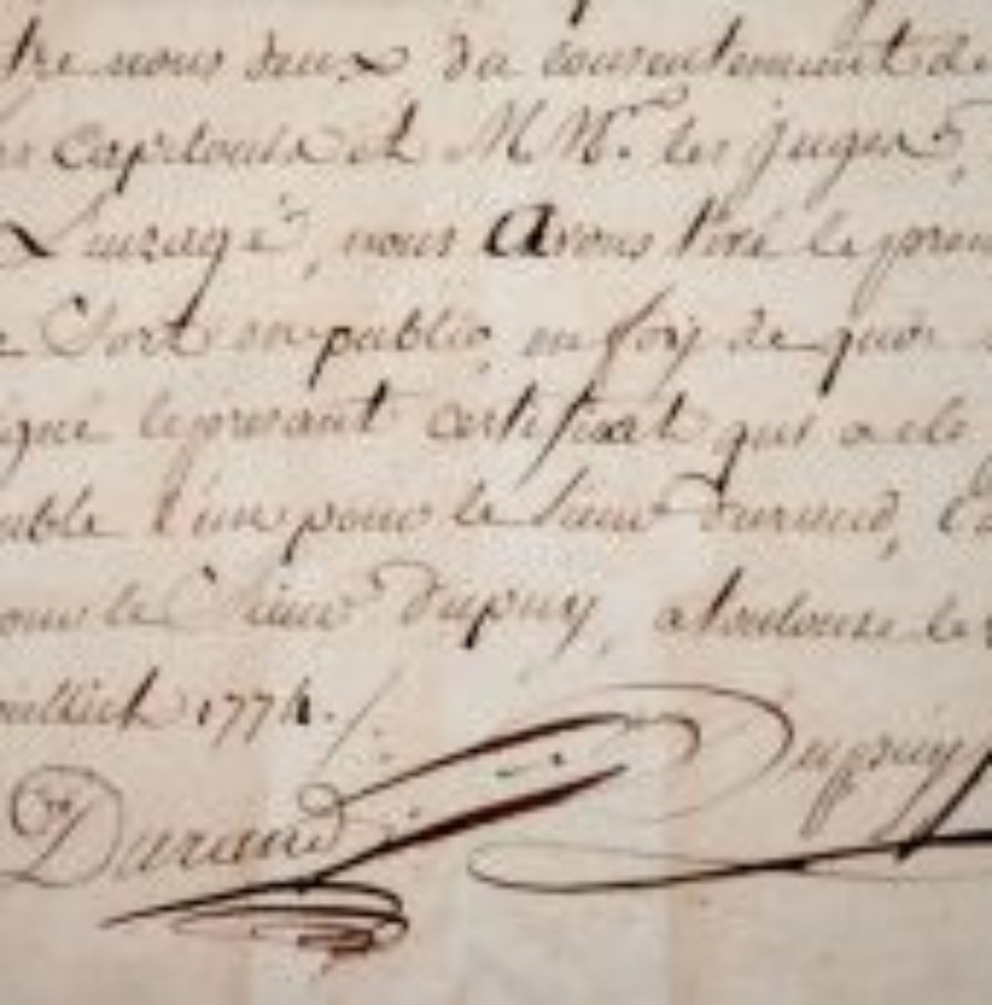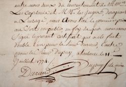 Curieux document : les deux vainqueurs du "prix des armes de Toulouse", étant des amis proches, refusent la tradition qui consiste en un assaut pour déterminer le premier prix. "Nous soussignés Louis Dupuy de Toulouse, et Joseph Durand de Lyon, certifions et attestons qu'étant l'un et l'autre parvenus à remporter un prix des armes à Toulouse, et que l'usage exigeant que le premier se disputât par un assaut, vu l'intime liaison qui a toujours régné entre nous deux, du consentement de MM. les Capitouls et MM. les juges, dérogeant à l'usage, nous avons tiré le premier prix au sort en public [...]". Document signé par les deux protagonistes.