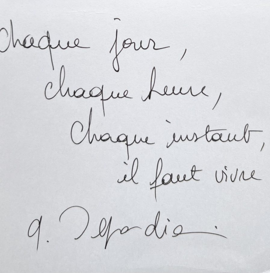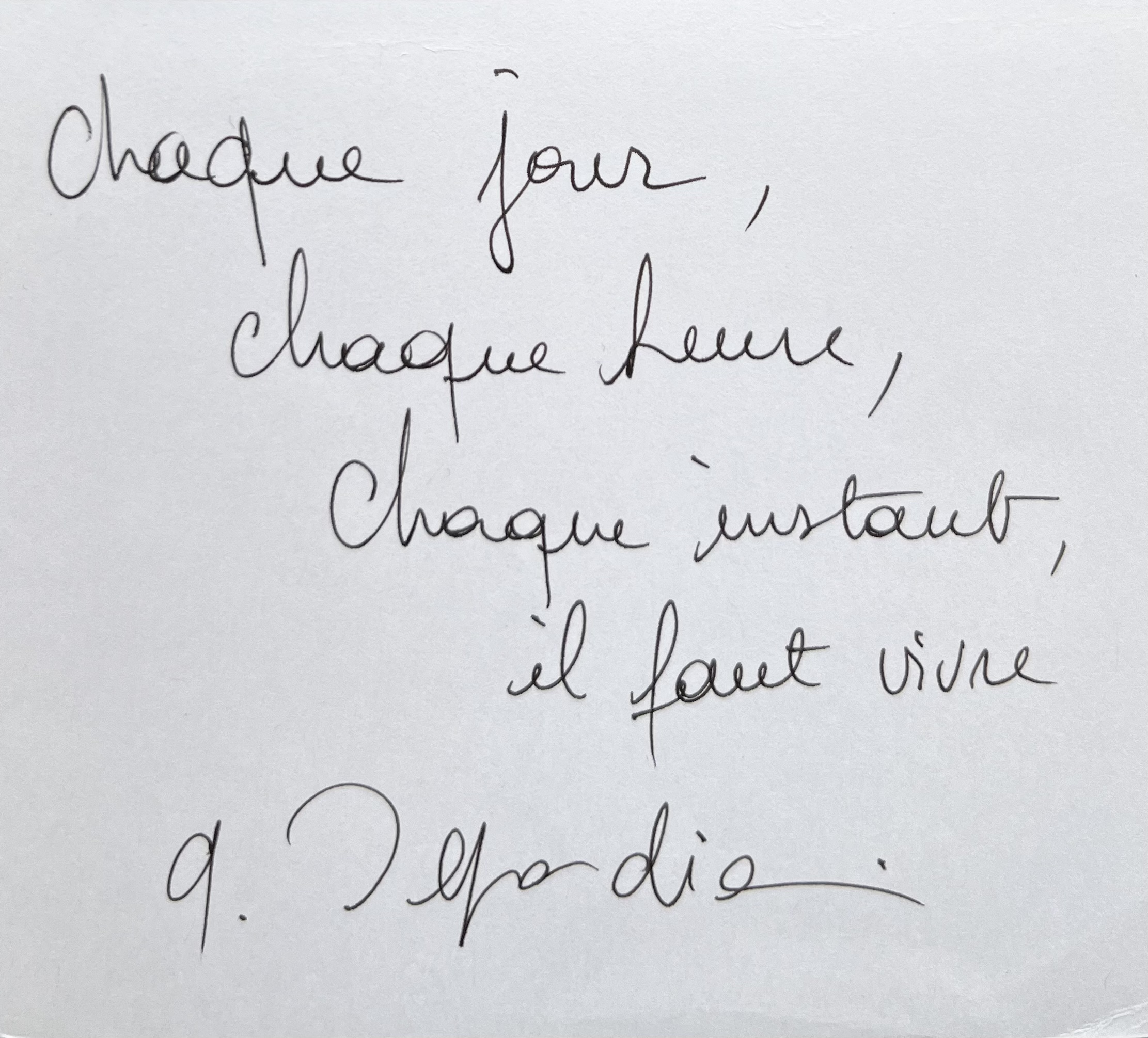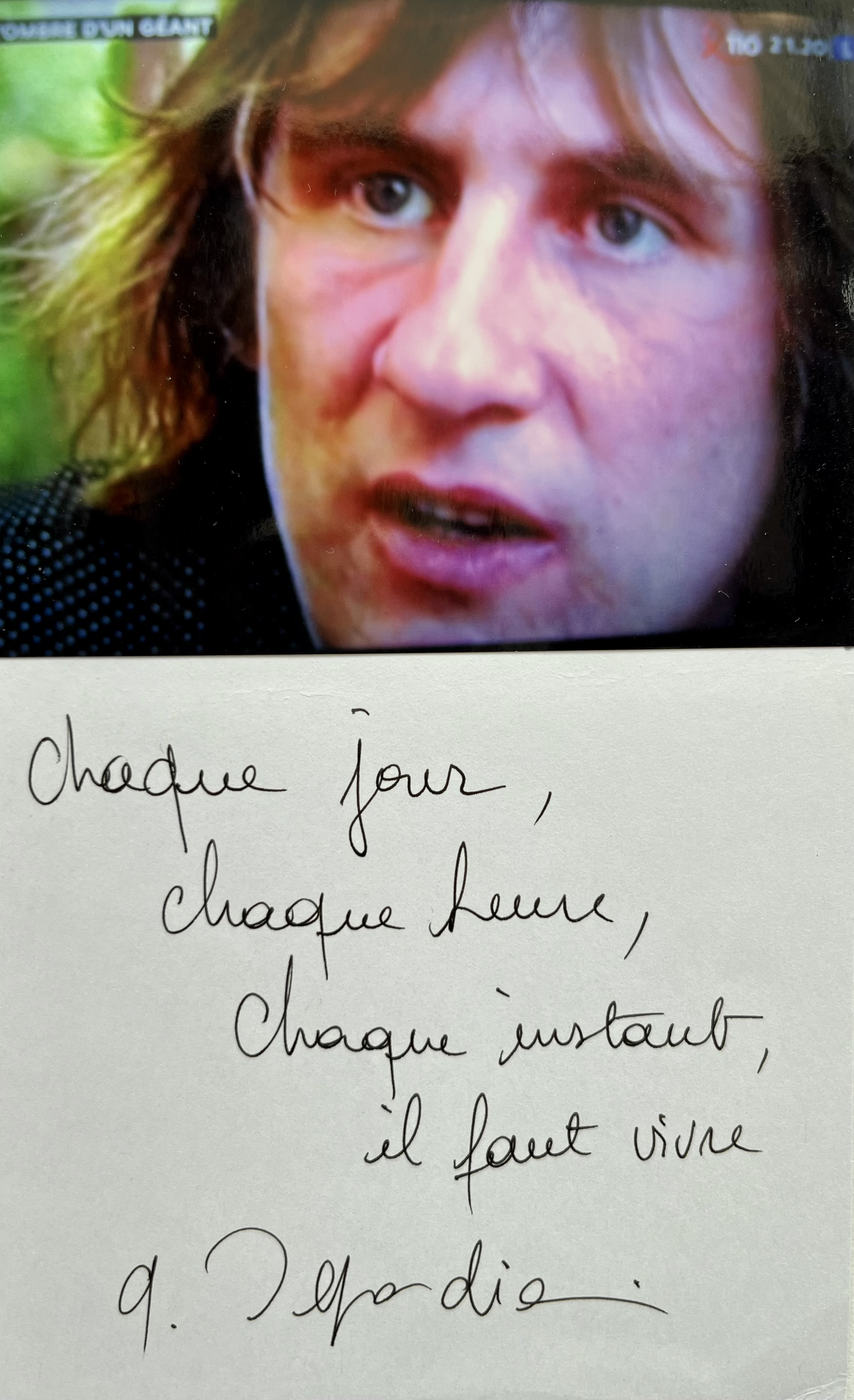 Devise autographe de Gérard Depardieu « Chaque jour, chaque heure, chaque instant, il faut vivre »