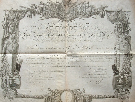 Diplôme de la Garde Nationale de Paris, qui autorise un chasseur de la 1ère compagnie à porter la décoration. Signé Charles-Philippe (le futur Charles X), contresigné par le maréchal Oudinot (commandant en chef), le duc de Clermont-Tonnerre (aide major général) et Deurbroucq (commissaire du sceau).