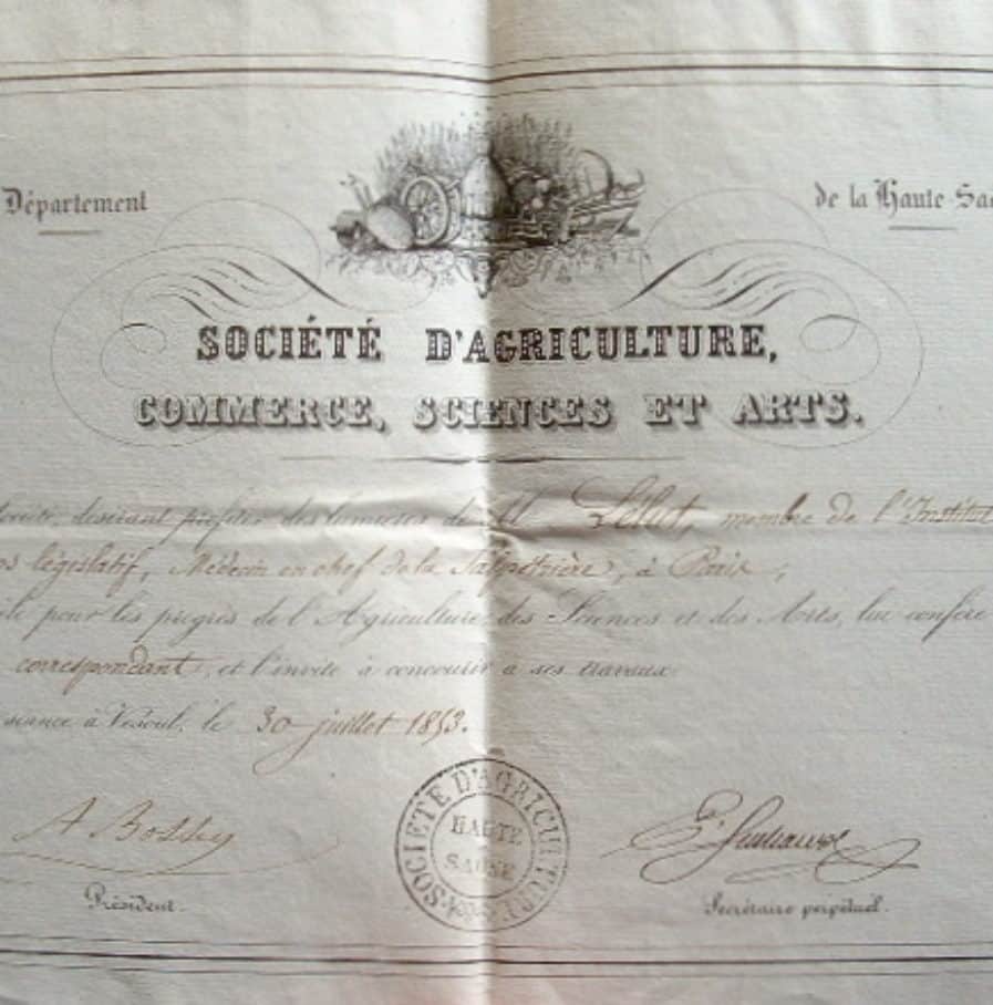 Diplôme de la Société d’agriculture de Haute-Saône.