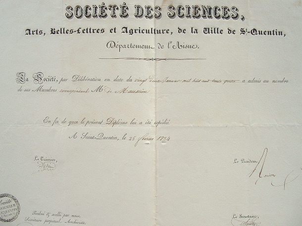 Diplôme de la Société des Sciences, Arts et Belles-Lettres de Saint-Quentin.