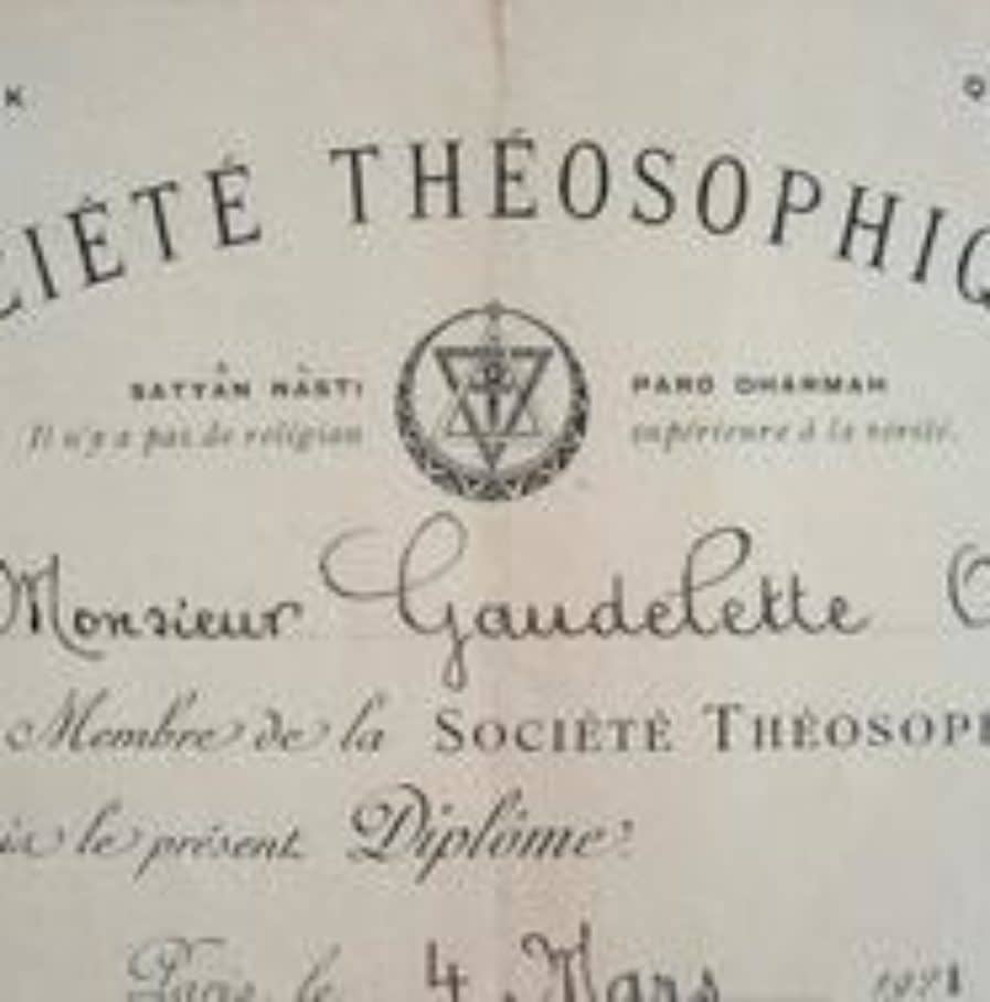 Diplôme de la Société théosophique remis à André Gaudelette, signé par la présidente Annie Besant (griffe) et le secrétaire général Charles Blech.