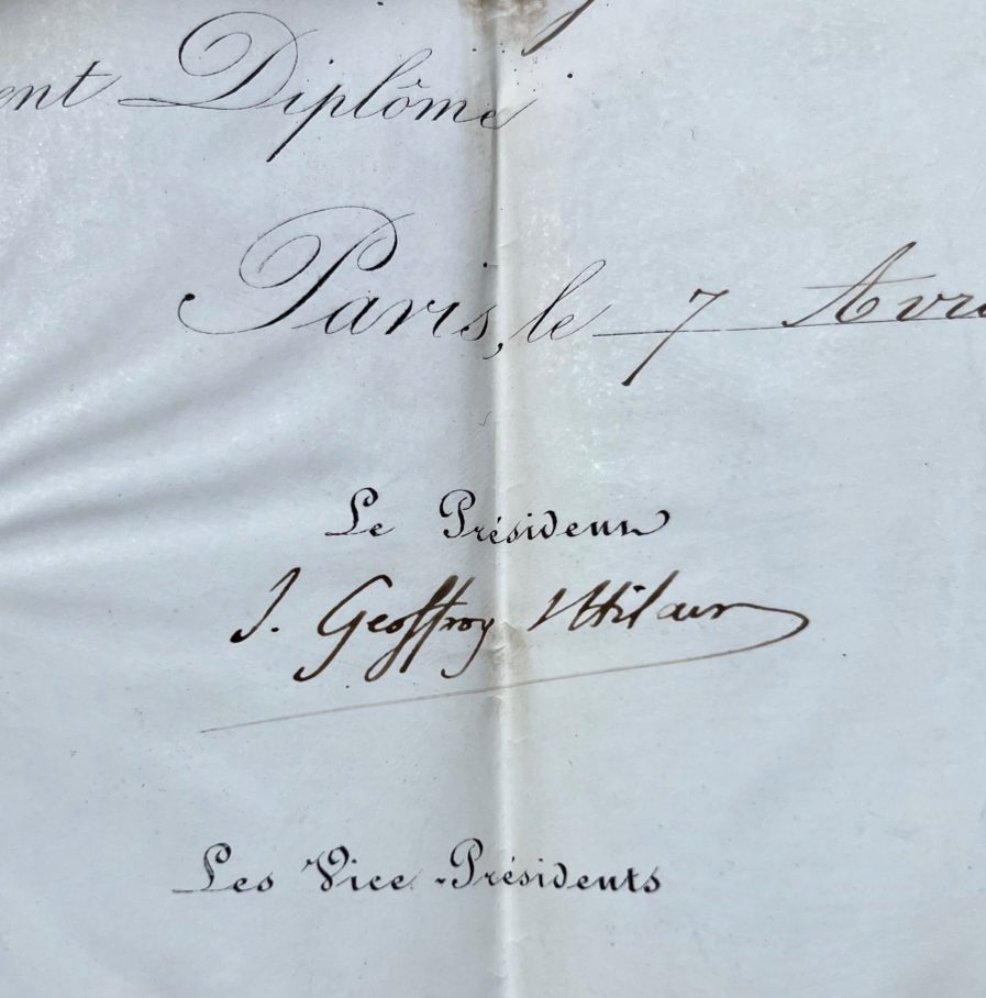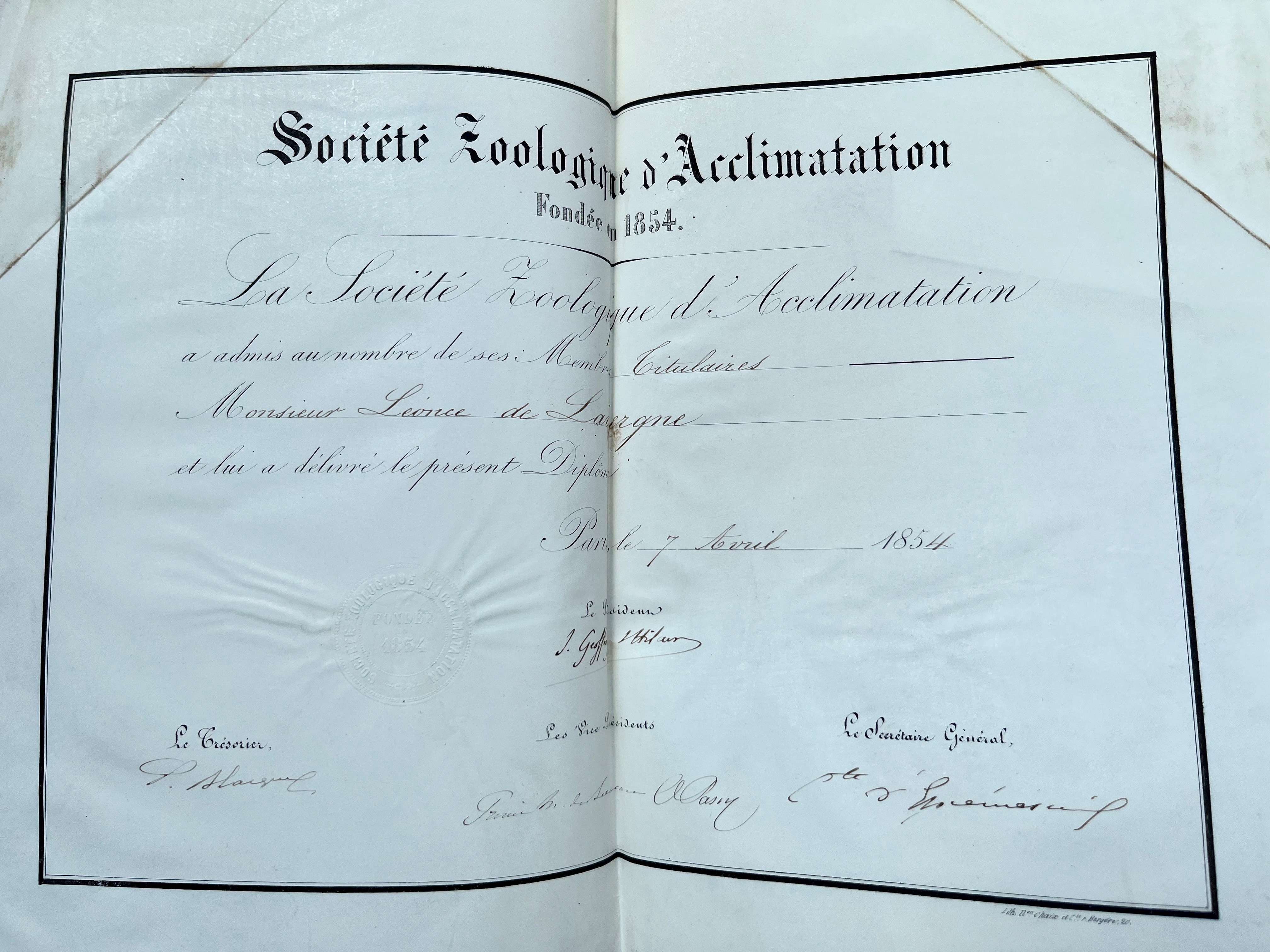 Diplôme de la Société Zoologique d'Acclimatation décerné à l'économiste, agronome et homme politique Léonce Guilhaud de Lavergne, mainteneur de l'Académie des Jeux floraux, membre de l'Académie des sciences morales et politiques. Signé par le président : Isidore Geoffroy Saint-Hilaire, les vice-présidents (Prince de Beauvau et Antoine Passy), le secrétaire général (comte d'Esprémesnil) et le trésorier (P. Blacque).
