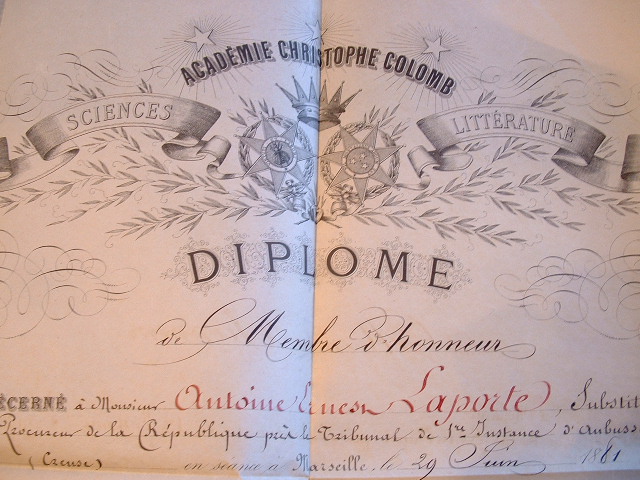 Beau diplôme de membre d'honneur de l'Académie Christophe-Colomb de Marseille, décerné à Antoine Erneste Laporte. Signé par le président-fondateur, Marc-André Papi, et plusieurs autres membres. Il porte le numéro 227.