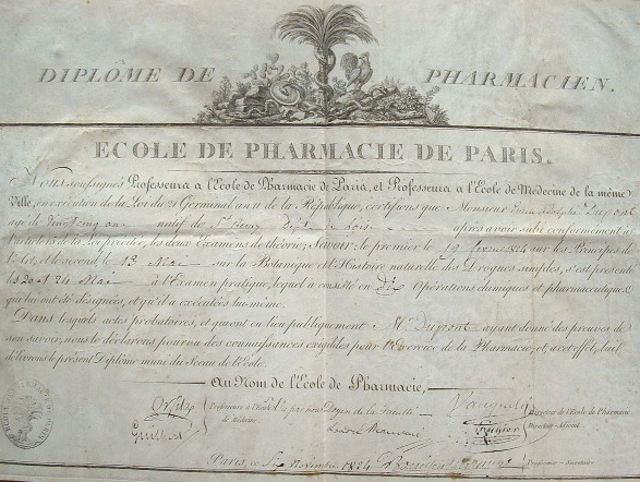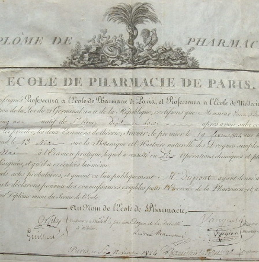 Diplôme de l'Ecole de Pharmacie de Paris, décerné à Emile Adolphe Dupont (né à Saint-Rémy, dans l'Oise, en 1799). Signé par les professeurs des écoles de pharmacie et de médecine de Paris, Vauquelin, Orfila, Guilbert, André Laugier (1770/1832, chimiste et pharmacien), Augustin Jacob Landré-Beauvais (1772/1840, professeur de médecine clinique) et Edme Jean Baptiste Bouillon-Lagrange (1764/1844, pharmacien).