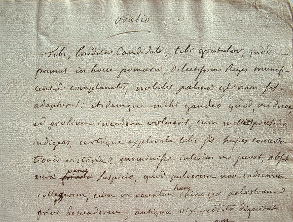 Manuscrit de Pierre-Joseph Desault, avec ratures et corrections, intitulé : "Pro actu publico D. Desault die 31 augusti 1776. Oratio". Discours de félicitations et d'exhortations à un candidat érudit, rappelant l'importance de la physiologie et de l'anatomie, ainsi que le passé glorieux de l'École de Médecine. En latin.