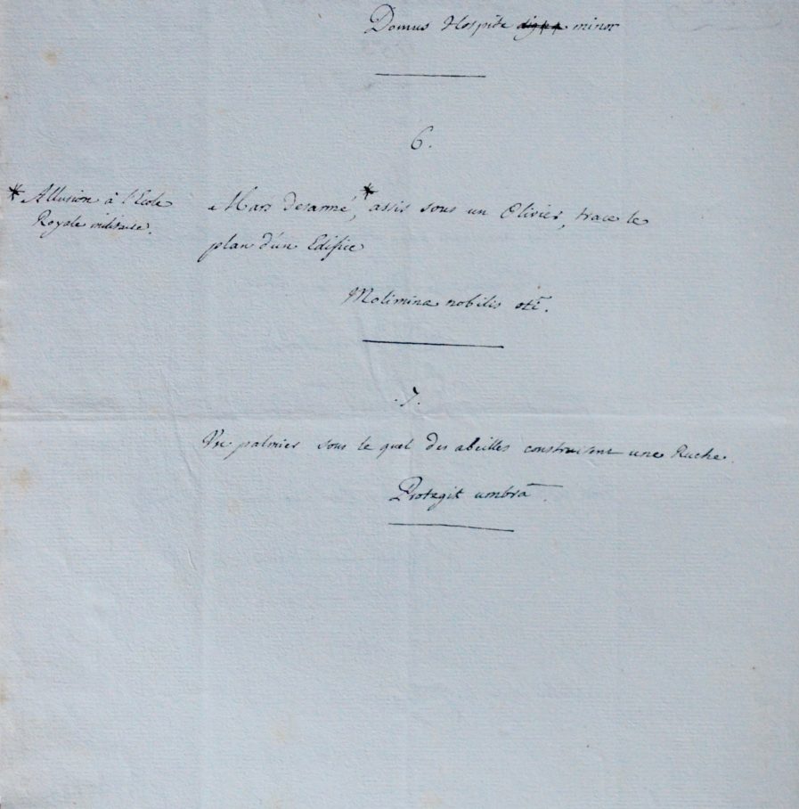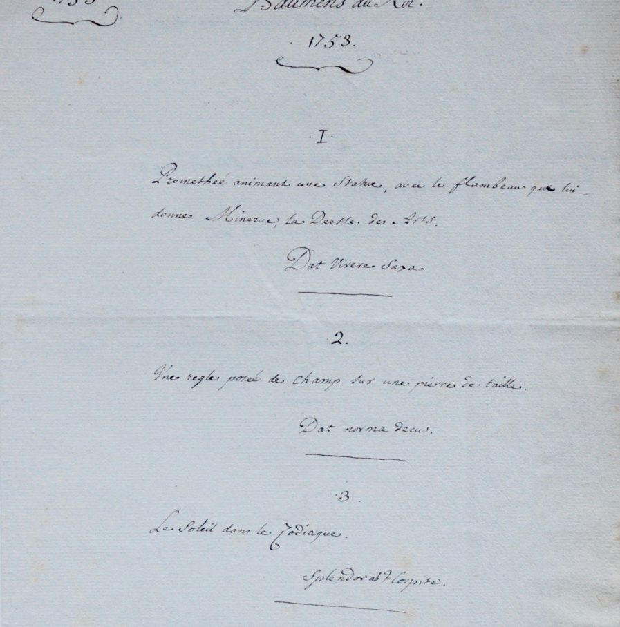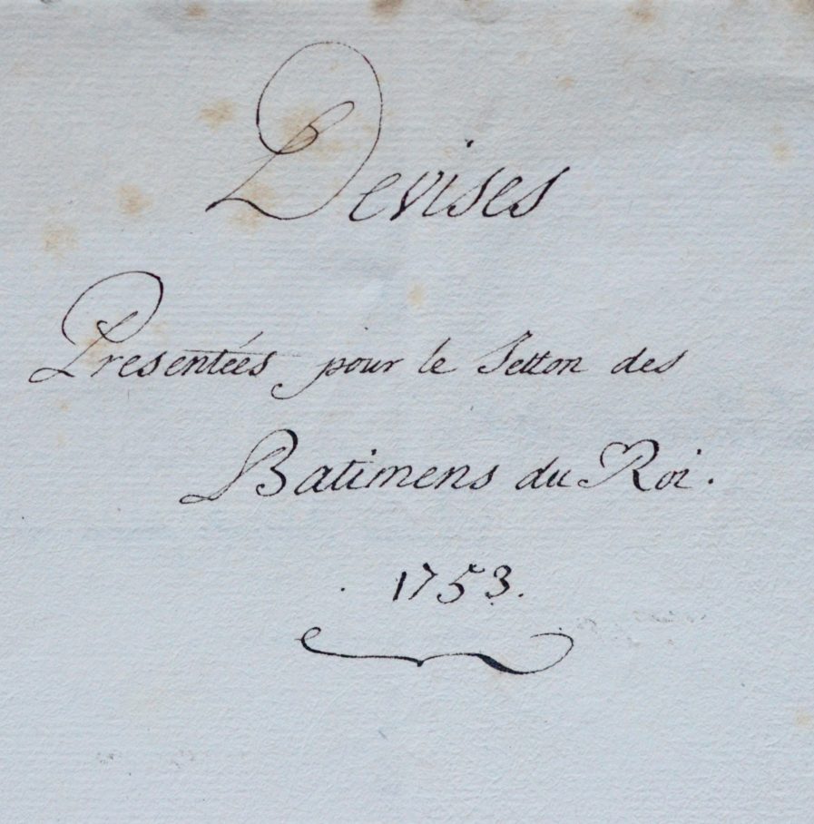 Liste autographe composée de sept Devises présentées pour le jetton des Batimens du Roi, avec description de l'image emblématique correspondant :