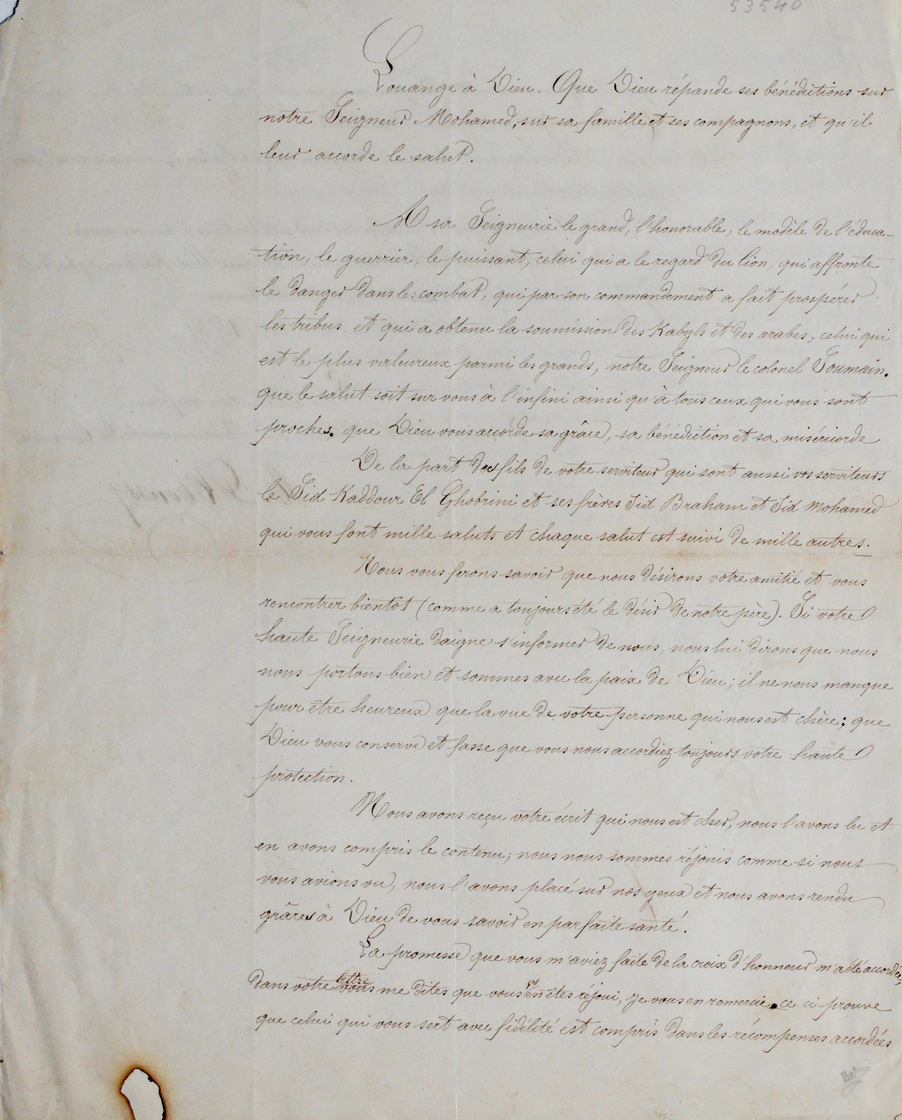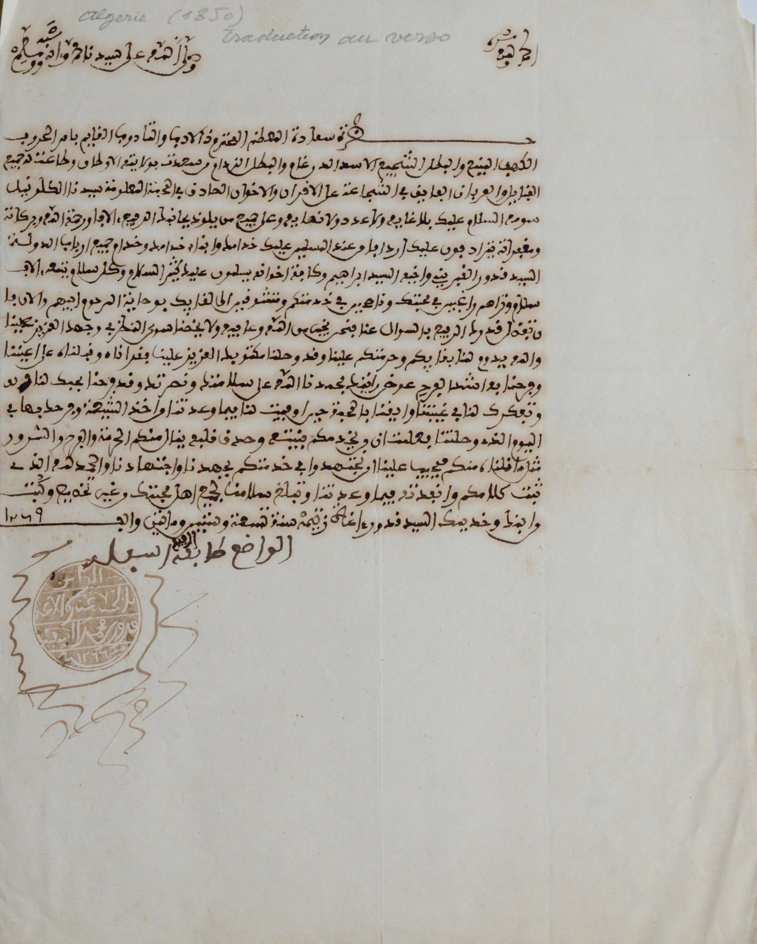 Pacification de l’Algérie. « De la part des fils de votre serviteur qui sont aussi vos serviteurs le Sid Kaddour El Ghobrini et ses frères Sid Braham et Sid Mohamed qui vous font mille saluts et chaque salut est suivi de mille autres. Nous vous ferons savoir que nous désirons votre amitié et vous rencontrer bientôt (comme a toujours été le désir de notre père). Si votre haute seigneurie daigne s’informer de nous, nous lui dirons que nous nous portons bien et sommes avec la paix de Dieu […] ».