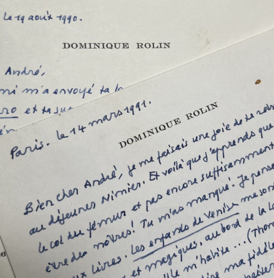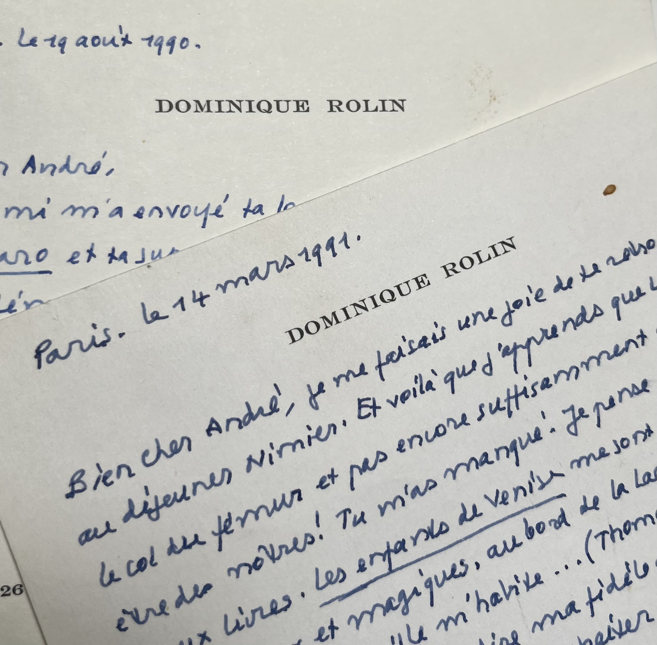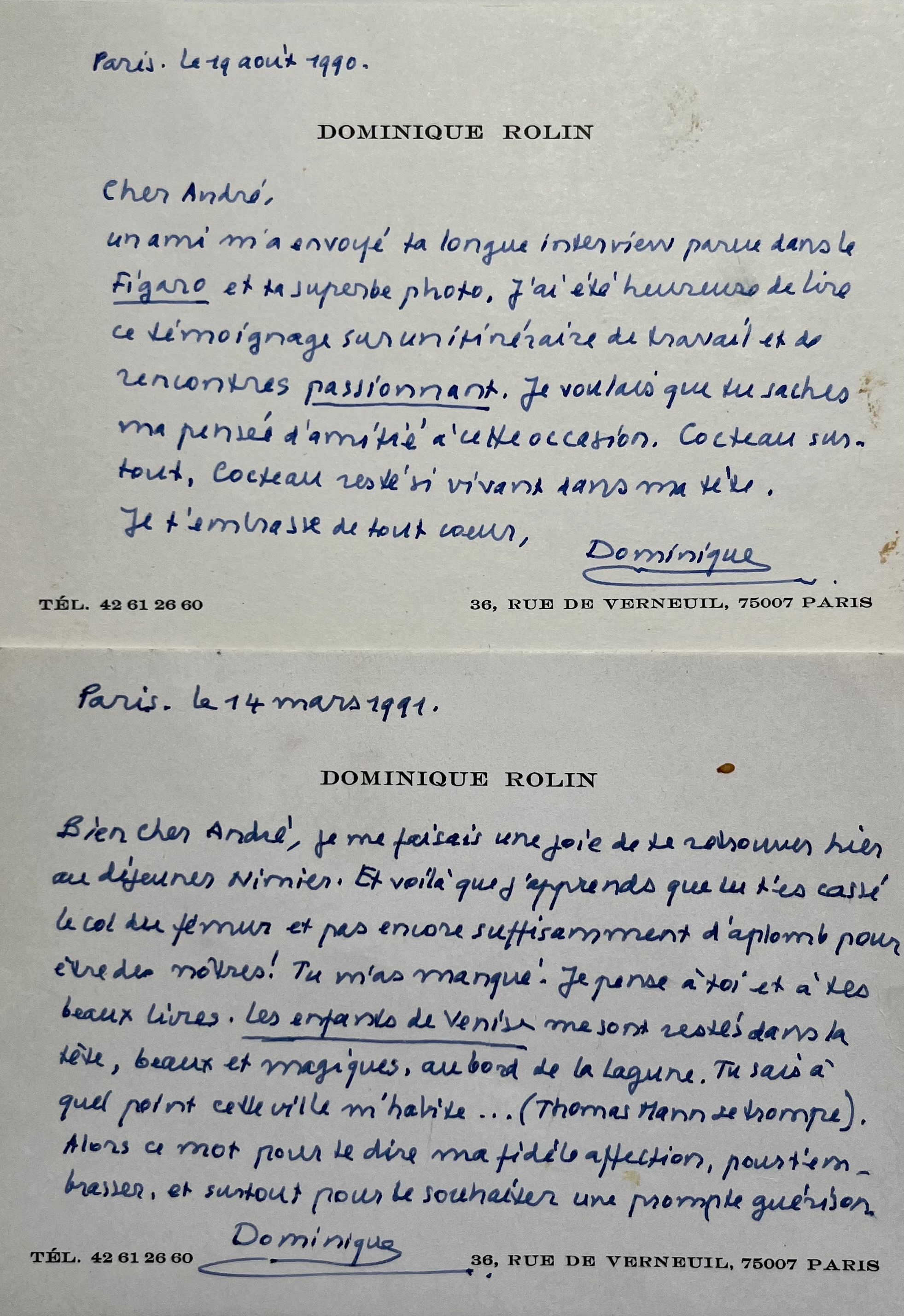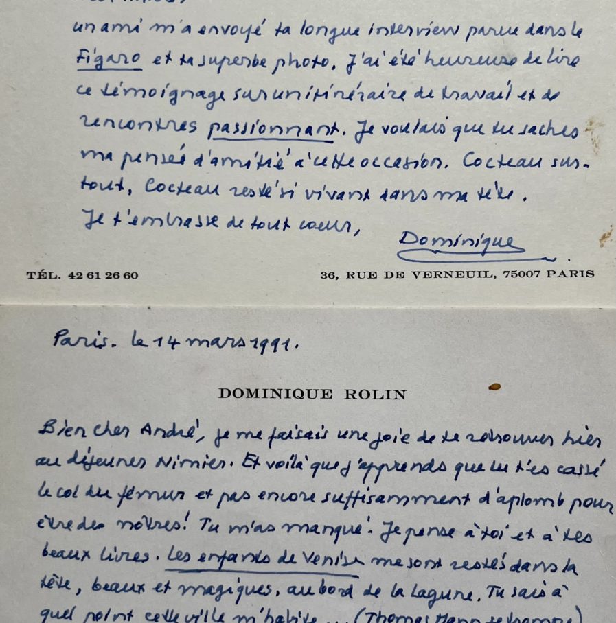 Dominique Rolin (Bruxelles , 1913/2012)"Cher André. Un ami m'a envoyé ta longue interview parue dans le Figaro et ta superbe photo. J'ai été heureuse de lire ce témoignage sur un itinéraire de travail et de rencontres passionnant. Je voulais que tu saches ma pensée d'amitié à cette occasion. Cocteau surtout, Cocteau resté si vivant dans ma tête [...]". Dans sa seconde carte, elle déplore l'absence de Fraigneau "au déjeuner Nimier" pour cause de col du fémur cassé. "Je pense à toi et à tes beaux livres. Les enfants de Venise me sont restés dans la tête, beaux et magiques, au bord de la lagune. Tu sais à quel point cette ville m'habite... (Thomas Mann se trompe). Alors ce mot pour te dire ma fidèle affection [...]".