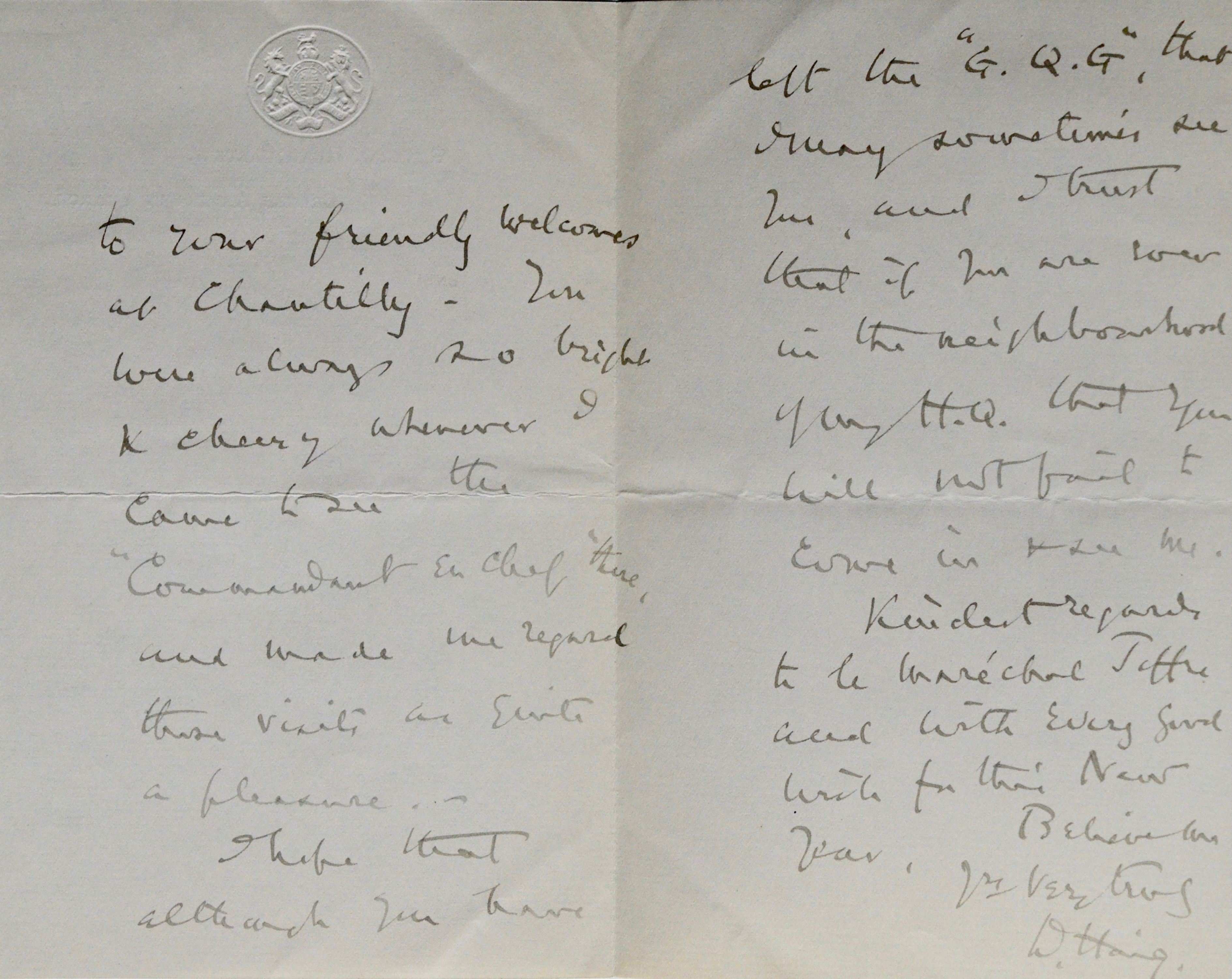 "My dear Thousellier. Thank you very much for so kindly writing to congratulate me. I appreciate your kind words very much indeed, and I too shall always look back hilt pleasure to your friendly welcomes at Chantilly. You were always so bright & cheery whenever I came here the Commandant en chef there, and made me regared these visits as quite a pleasure. I hope that altitude you have left the "G.Q.G." [...]". Il salue chaleureusement le Maréchal Joffre.