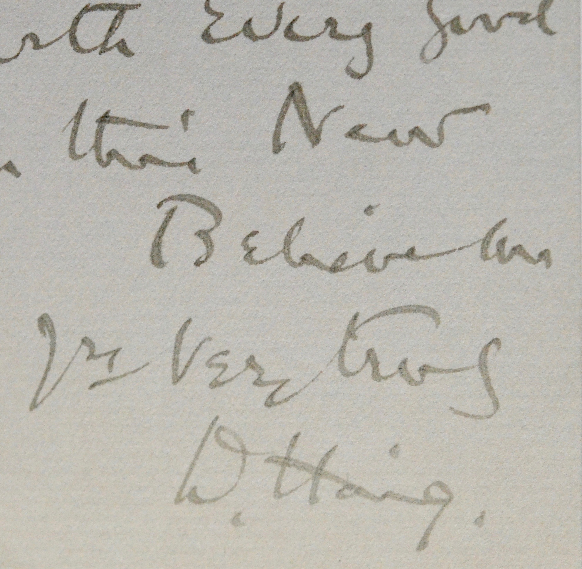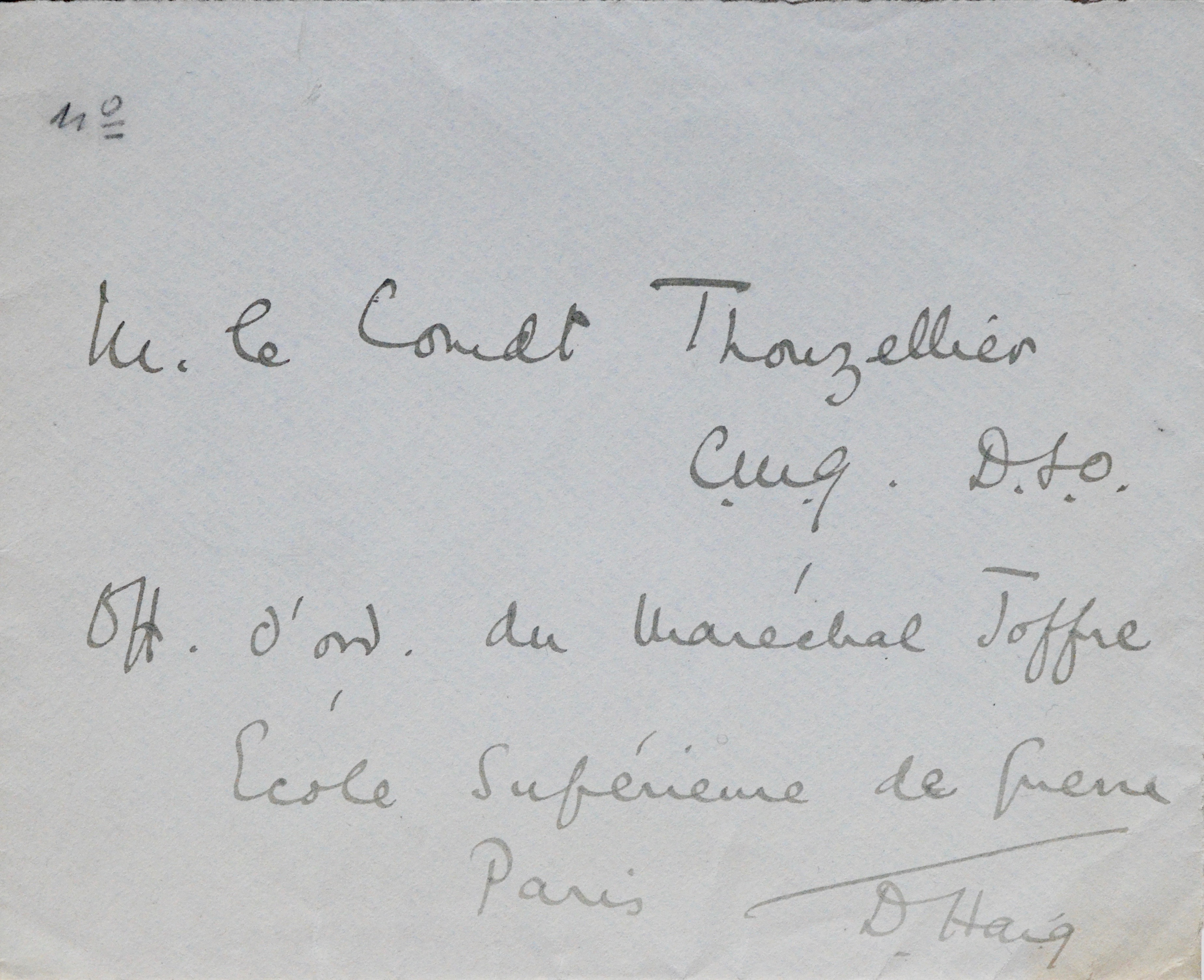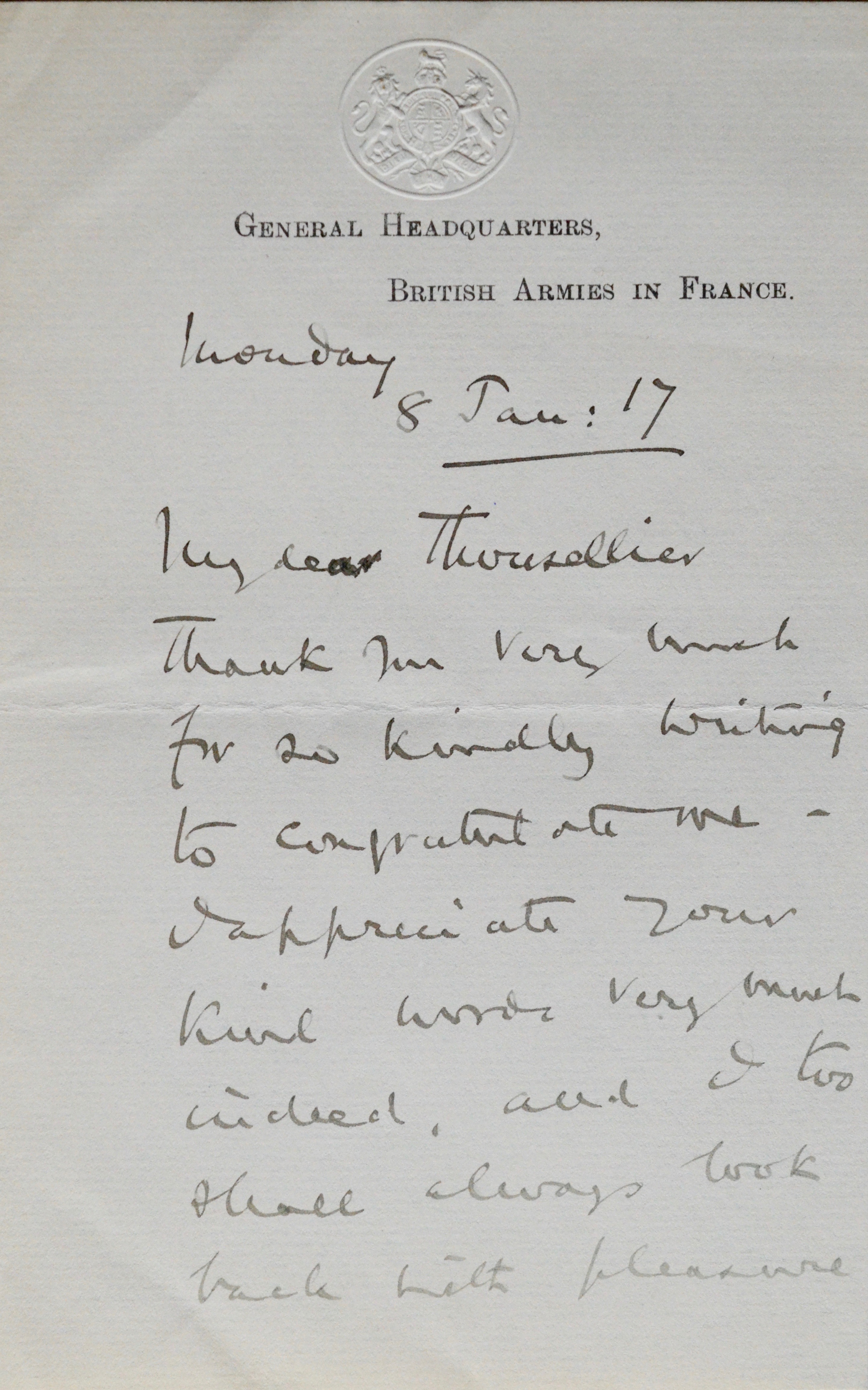 Haig remercie avec ferveur le commandant Thouzellier de lui avoir si gentiment écrit pour le féliciter. "[...] J'apprécie énormément vos aimables paroles et, moi aussi, je souviendrais toujours avec plaisir pour votre accueil si chaleureux à Chantilly [...]".