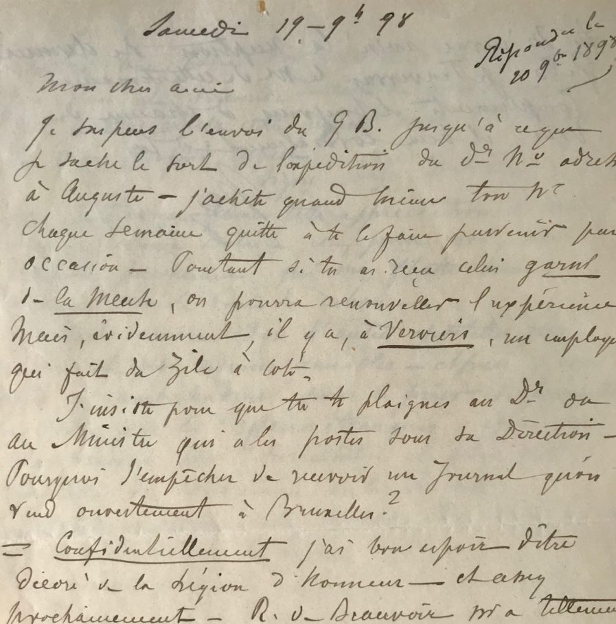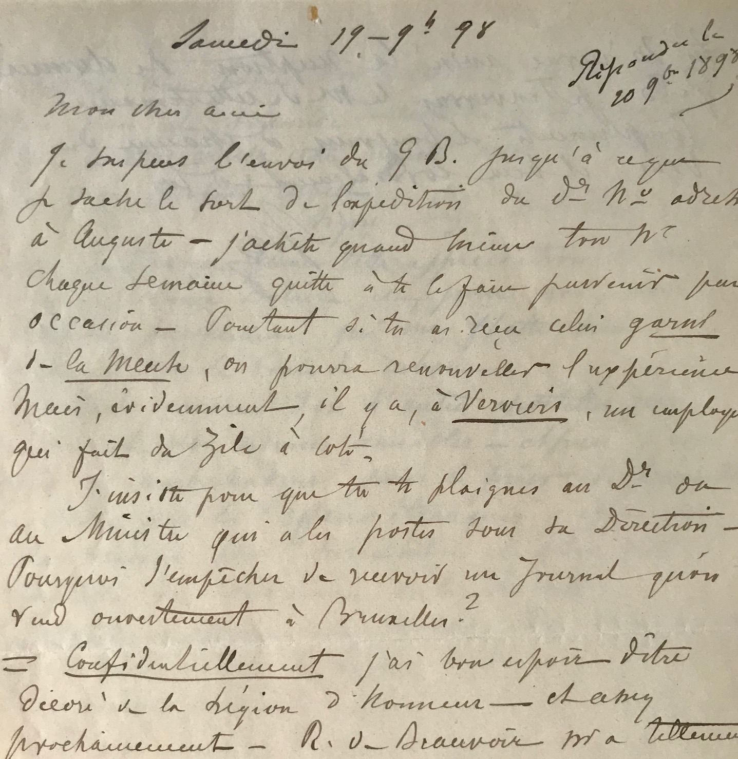 L’artiste se plaint de ne pas recevoir à Verviers, province de Liège, certains journaux. Il demande à son correspondant d'en référer au Ministre des Postes. Il affirme :  "[...] J’ai bon espoir d’être décoré de la légion d’honneur et assez prochainement [...]Pour te donner une idée ? copie ci-dessous les 3 apostilles qui suivent celles que notre ambassadeur à Paris a ajouté à ma demande – car il faut la demander cette croix [...]". Il cite tout d'abord Jules Claretie : "M. Draner est un artiste dont le nom populaire dit toute la brillante carrière", puis : "Bertrand le directeur de l’Opera rappelle que j’ai été le dessinateur attitré des variétés pendant 30 ans "Sa collaborations dans les premiers journaux illustrés lui a valu une réputation universelle [...]. Quant à [Edouard] Detaille, voilà son coup d’épaule qu’il m’a remis ce matin même [...] "M. Draner, français de cœur, a incarné toute une époque – son œuvre est considérable et constitue une source de documents qui touche déjà à l’Histoire" [...]Je t’avoue qu’une telle appréciation d’un homme comme Detaille est pour moi un véritable parchemin qui me flatte bien autrement que le bout de ruban ».