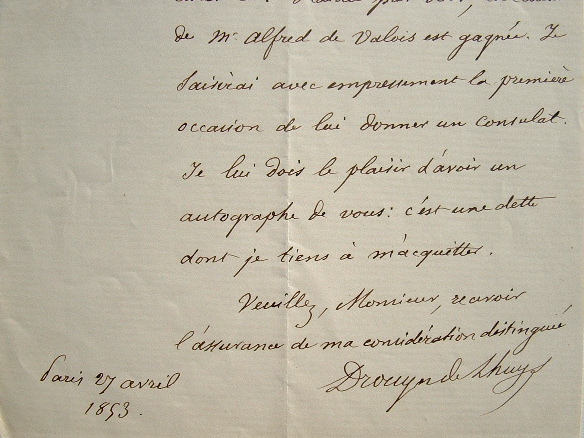Drouyn de Lhuys accepte d'offir un consulat «à la première occasion» au protégé de son correspondant, Alfred de Valois. «Je lui dois le plaisir d'avoir un autographe de vous : c'est une dette dont je tiens à m'acquitter». [Alfred de Valois sera envoyé, au Mexique, à La Havane puis au Guatemala ; il publiera ses Notes de voyages en 1861].