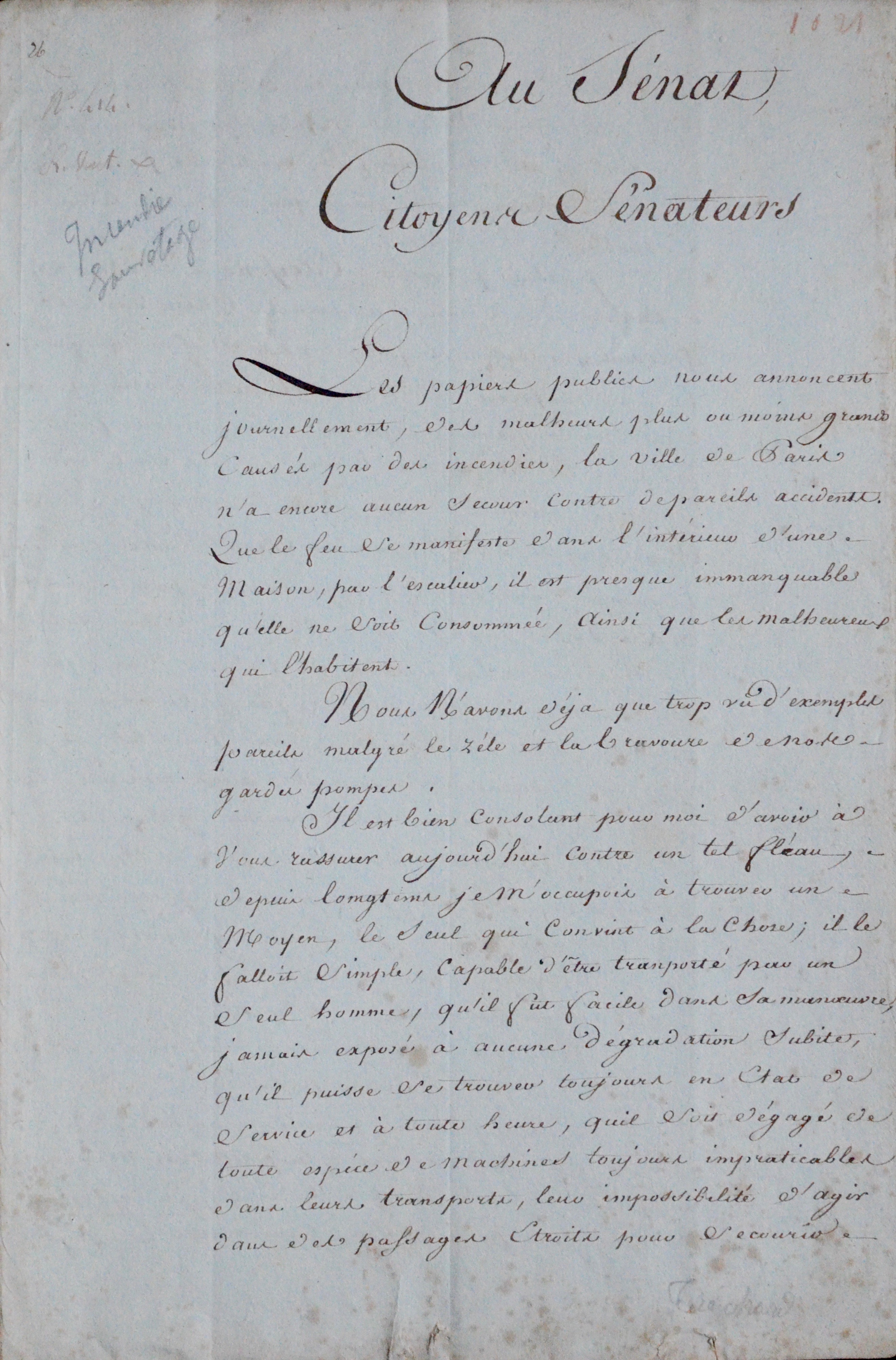 Dans cette lettre, l'auteur, Tréchard, vante les avantages de son procédé : "Je suis parvenu à trouver des secours universels c'est à dire ils passent partout où la pompe peut se communiquer ; tout est renfermé dans une nacelle d'osier qu'un seul homme peut transporter à la première fois ; on peut les manoeuvrer sans jamais se servir d'aucune entrée de la maison incendiée ; eut-elle six étages, dans l'espace de six minutes, j'introduis la pompe dans tous les appartemens, je me rends maitre du feu, et l'on est en train de sauver tout le monde avec la rapidité de l'éclair, sans que les malades les plus infirmes fussent le moindrement exposés, je les vais chercher dans leurs lits et je puis les transporter sans qu'ils aient rien vu ; les effets les plus précieux se sauvent également. Je réponds désormais du feu des spectacles, personne ne peut périr, je rassure les propriétaires sur leurs propriétés, je réponds également de la vie des citoyens, dans un semblable danger, toute la ville sera désormais en sûreté. J'ai fait une expérience par ordre du Préfet de police rue St Louis au Palais. J'en ai fait une seconde par ordre du Préfet du département, à la préfecture même, le préfet lui a donné sa sanction, j'ai l'approbation du corps des pompiers qui conviennent que c'est le seul moyen de secours praticable en cas de feu violent. J'ai également l'approbation des commissaires nommés et les applaudissements du public présent. Je m'engage à fournir tous les secours nécessaires au corps de garde des pompiers à mes frais, il n'en coutera rien au gouvernement. J'attends qu'il ordonne l'exécution de mon projet [...] ".
