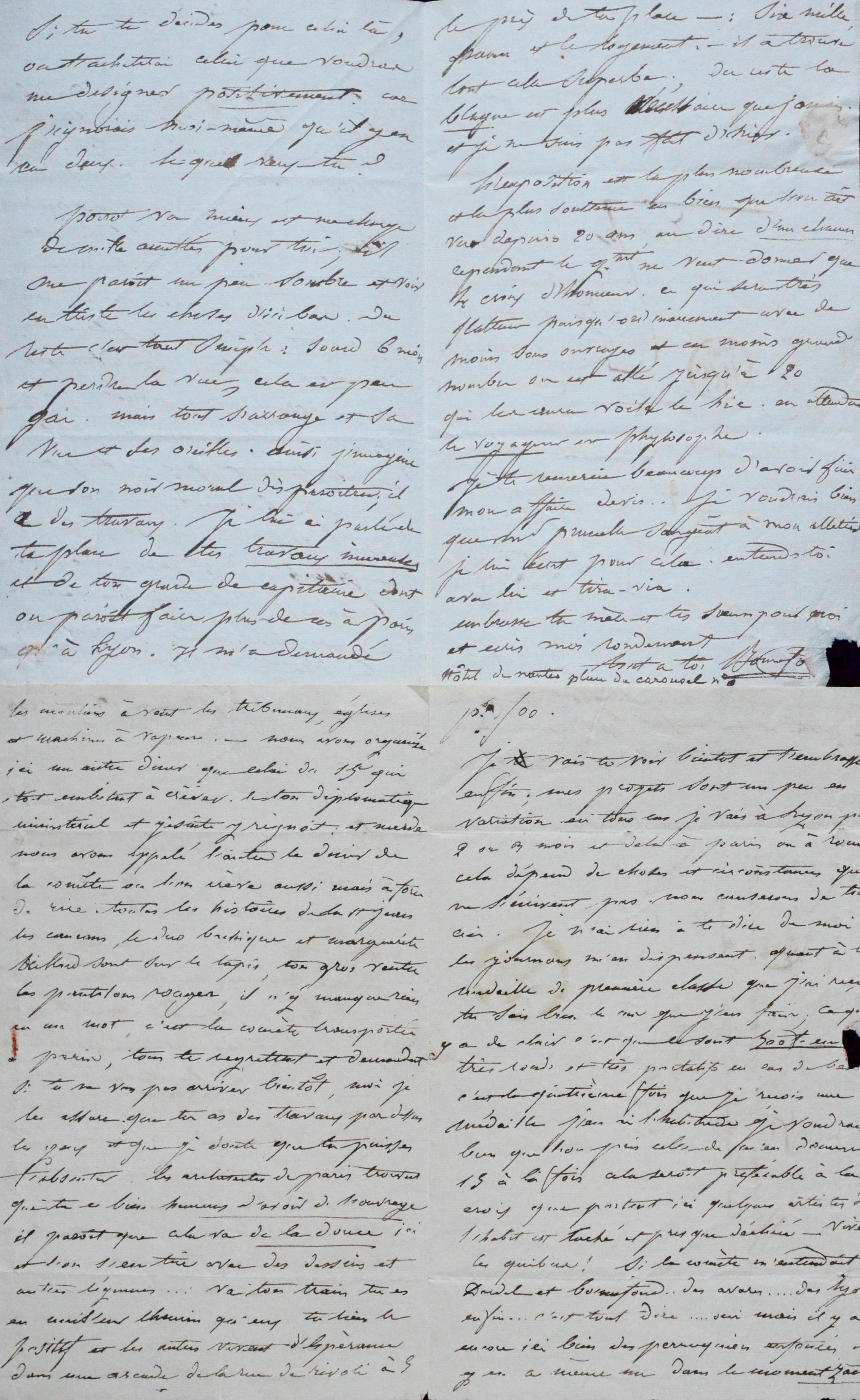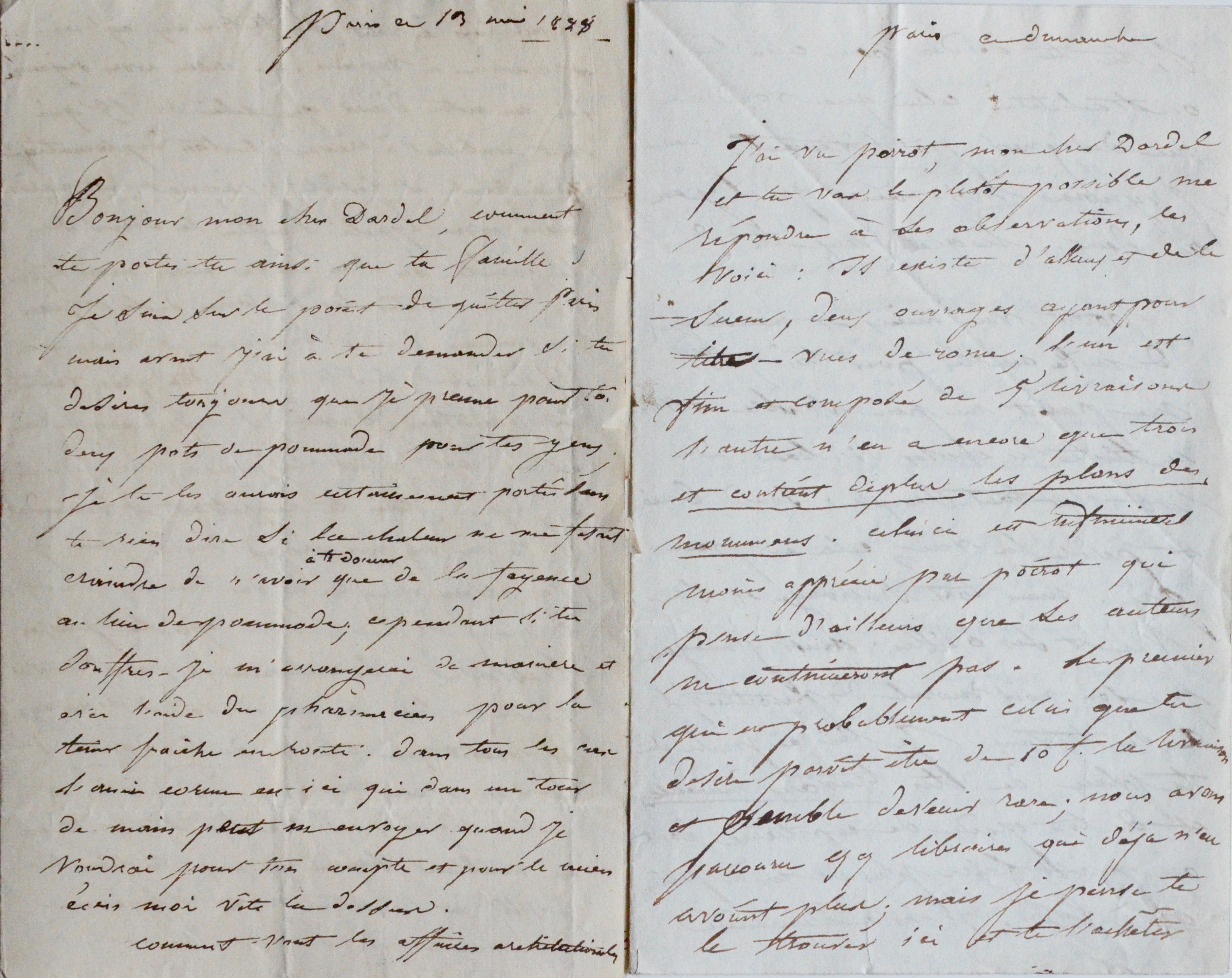 - [11] juillet 1831. [Bonnefond est directeur de l'École des beaux-arts de la Lyon depuis peu]. Il évoque deux ouvrages d'Alaux et Lesueur, intitulés "Vues de Rome", composés de plusieurs livraisons dont une avec des plans dépliants des monuments. "Le premier qui est probablement celui que tu désires paraît être de 10 f. la livraison et semble devenir rare ; nous avons parcouru qq libraires qui déjà n'en avaient plus ; mais je suis sensé te le trouver ici [...]". Bonnefond évoque un ami commun nommé Poirot [le peintre Achille Poirot ?], sourd et presque aveugle, ce qui est "peu gai", mais en passe de recouvrer la santé. A propos d'une exposition : "L'exposition est la plus nombreuse et la plus soutenue en bien que l'on ait vu depuis 20 ans, au dire d'un chacun. Cependant le gvt ne veut donner que 4 croix d'honneur, ce qui sera très flatteur [...]".