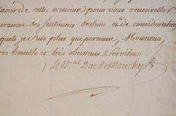 «Je vous suis très obligé, monsieur, de l'avis que vous voulez bien me donner du vin de Malaga que M. le chevalier de Monteils vous a adressé, et je profite avec plaisir de cette occasion pour vous renouveler les assurances des sentiments d'estime et de considération [...]».
