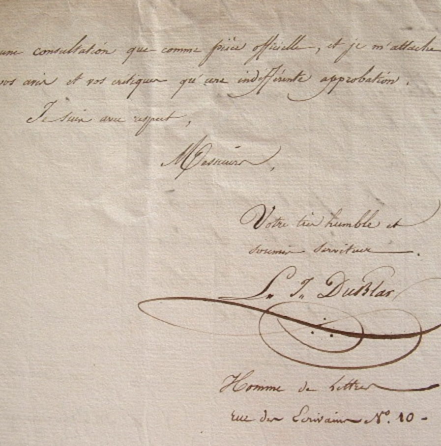 Lettre de L.J. Dublar demandant l'approbation de l'Académie des Sciences pour son système d'écriture universelle, appelé "Idéolographie", et l'instrument qu'il vient de mettre au point, appelé "multlinégraphe", «instrument à l'aide duquel on peut improviser l'écriture, apprendre à écrire sans maître et faire écrire les aveugles». A ce titre, il adresse une brochure extraite d'un recueil plus complet qu'il publie sous le titre Les 5 ordres de l'Ecriture, où il «classifie toutes les figures qui servent à tracer nos pensées». (Brochure absente).