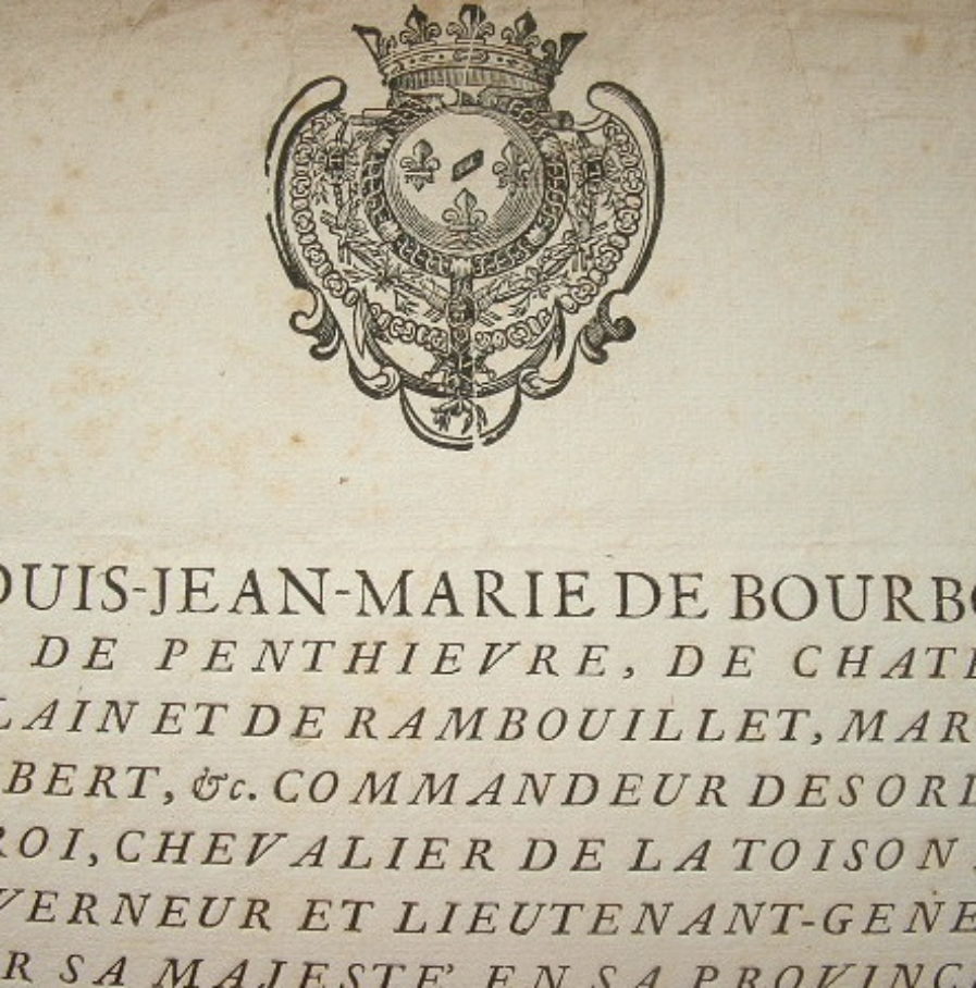 Ordre donné à Pierre Guyet, de «s'abstenir d'entrer à l'assemblée des Etats de Bretagne, jusqu'à ce qu'il ait produit les titres en vertu desquels il s'est fait inscrire sur la liste des gentilshommes [...]». Avec une pièce manuscrite signée (découpée en bordure avec manque de texte) adressée au Garde des Sceaux, Toulon, 13/10/1754.