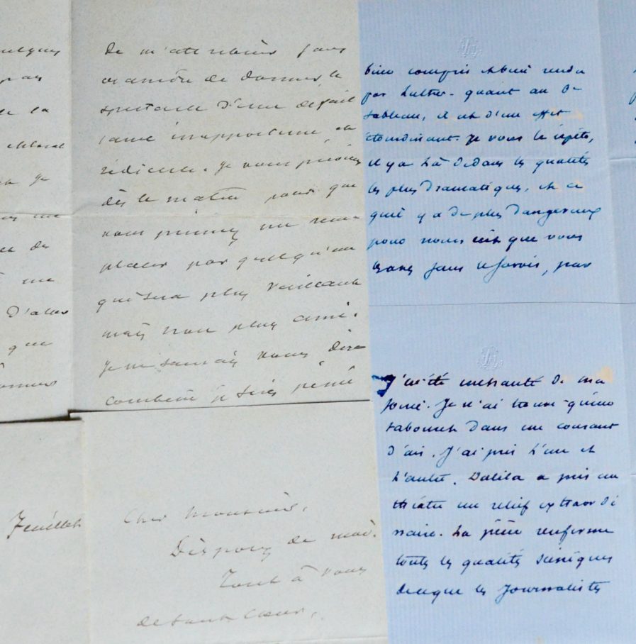 - Longue et belle lettre de Dumas fils (8 pages), adressée à Octave Feuillet, après une soirée au théâtre où il assista au triomphe de Dalila : "[...] Dalila a pris au théâtre un relief extraordinaire. La pièce renferme toutes les qualités scéniques [...] c'est là un très beau et très franc succès. [...] la scène de la loge est faite de main de maître, ainsi que tout le tableau [...] des passions humaines [...]".