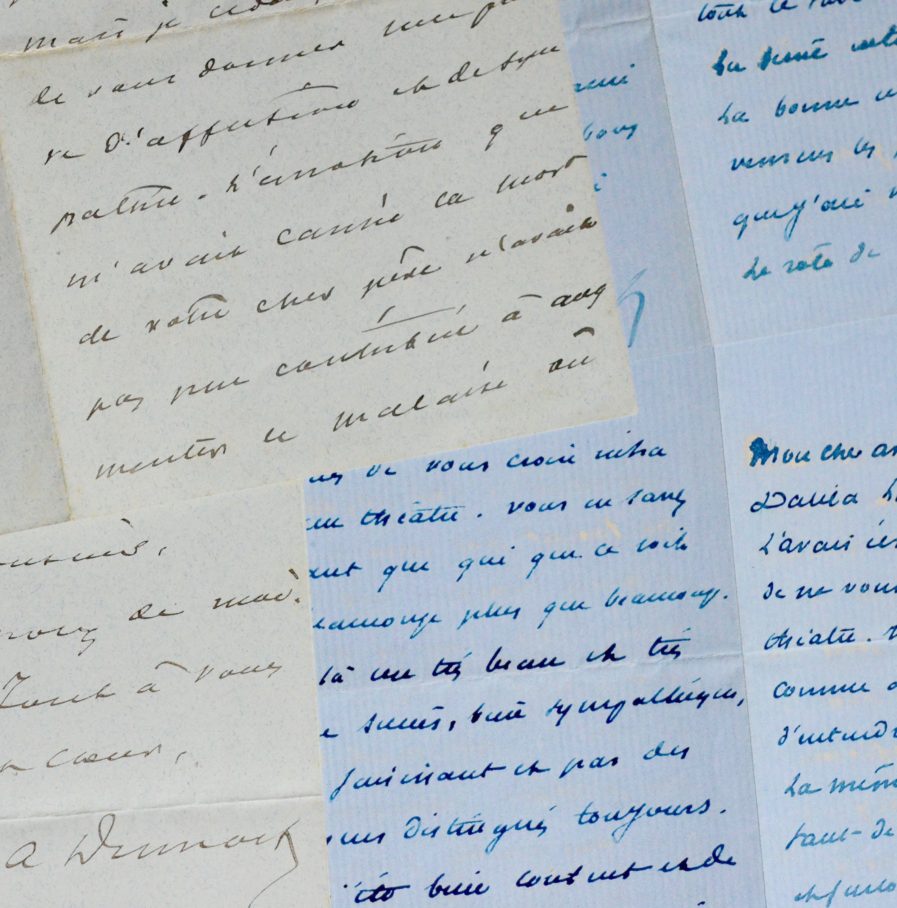 Encre turquoise sur feuillets doubles de papier vergé bleu et encre noire sur feuillets doubles de papier vert. Une enveloppe conservée.