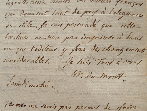 Etienne Dumont (Genève, 1759/1829)Lettres d'Etienne Dumont écrites au moment de sa traduction de l'ouvrage de Romilly, "Règlements observés dans la chambre des Communes" (1789). Les deux hommes partagent les mêmes idées avant-gardistes des Encyclopédistes sur la liberté de penser et d'entreprendre. Quelques mois plus tard, ils vont accueillir la Révolution française avec enthousiame. «Je viens d'achever, mon cher Romilly, la brochure que vous m'aviez remise. Elle est très intéressante et très bien pensée, elle contient des vérités qu'il est utile de répandre en France et peut y servir la grande cause de la liberté dont votre ami est bien digne d'être le défenseur [...]». Il fait cependant des remarques sur le style et la structure grammaticale qui lui semblent incompatbibles avec une édition en France. «S'il n'y avait qu'un air étranger répandu sur cet ouvrage, il pourroit ajouter à son mérite réel, celui d'une nouveauté piquante, mais les barbarismes nombreux ne produisent pas le même effet et dégoûteroient bientôt des lecteurs français qui donnent tant de prix à l'élégance du stile. Je suis persuadé que cette brochure ne sera pas imprimée à Paris ou que l'éditeur y fera des changements considérables». Dans la seconde lettre, il évoque la rédaction du Courrier de Provence [journal qu'il a dirigé avec Mirabeau en 1789-1790] et des problèmes de courrier avec l'Assemblée Nationale.