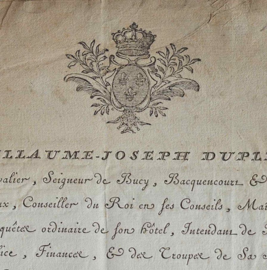 Guillaume-Joseph Dupleix de Bacquencourt (Bordeaux, 1727/1794)Par cet arrêt, Guillaume-Joseph Dupleix de Bacquencourt annonce une remise accordée par le roi Louis XV sur les impôts en Picardie pour l'année 1771 : «La taille de la généralité de Picardie est fixée pour l'année mil sept cent soixante onze par le brevet de la généralité à la somme d'un million soixante huit mille cent soixante trois livres seize sols. Mais aiant plu à Sa Majesté d'accorder à cette généralité une remise de vingt mille livres pour ladite année mil sept cent soixante onze, il a été par nous Intendant susdit et en exécution des ordres de Sa Majesté à nous adressés, procédé à la répartition de ladite remise sur les élections de cette généralité. En conséquence dans ladite somme de vingt mille livres de remise accordée par Sa Majesté, il en appartiendra à l'élection de Péronne la somme de trois mille sept cent quarante cinq livres dix nef sols sept deniers. Et ladite somme de trois mille sept cent quarante cinq livres dix neuf sols sept deniers sera répartie sur chaque Paroisse et sur les contribuables à proportion des accidens qu'ils ont souffert suivant nos ordonnances qui seront à cet effet délivrées aussitôt que les rolles des paroissiens auront été faits et vériffiés.»
