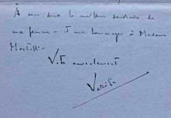 Edgar Varèse annonce son retour à Paris et propose de le voir. "Voulez-vous venir jeudi après-midi vers 5h 1/2? Je serai heureux de vous revoir, et de faire connaissance avec votre musique. A vous deux le meilleur souvenir de ma femme - et mes hommages à madame Martelli".