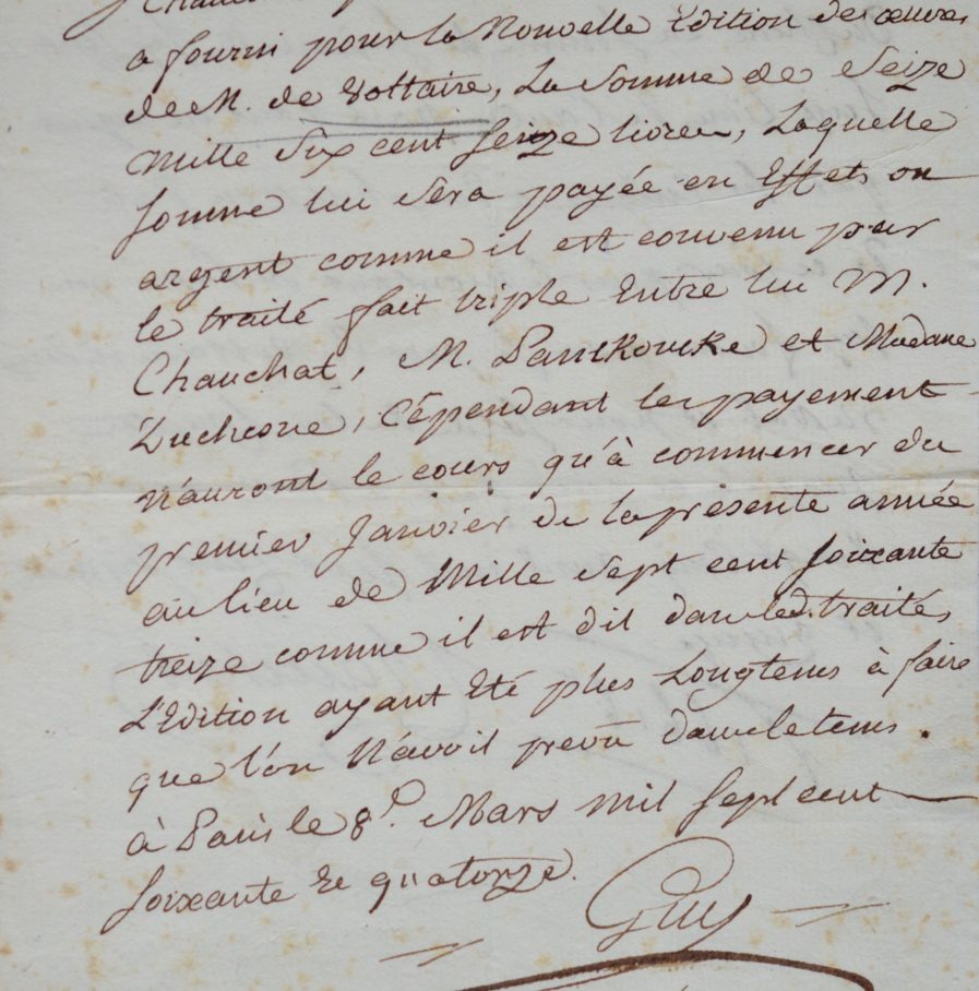 "Je soussigné déclare qu'il est du à Monsieur Chauchat pour la moitié du papier qu'il a fourni pour la Nouvelle Edition des oeuvres de M. de Voltaire, la somme de seize mille six cent seize livres, laquelle somme lui sera payé en effet ou argent comme il est convenu par le traité fait triple entre lui M. Chauchat, M. Panckoucke et Madame Duchesne. Cependant les payements n'auront cours qu'à commencer du premier janvier de la présente année au lieu Mille sept cent soixante treize comme il est dit dans le traité. L'édition ayant été plus longtems à faire que l'on n'avoit prévu dans le tems. À Paris le 8 Mars mil sept sent soixante et quatorze". Signé "Guy Pr. Ve. Duchesne".