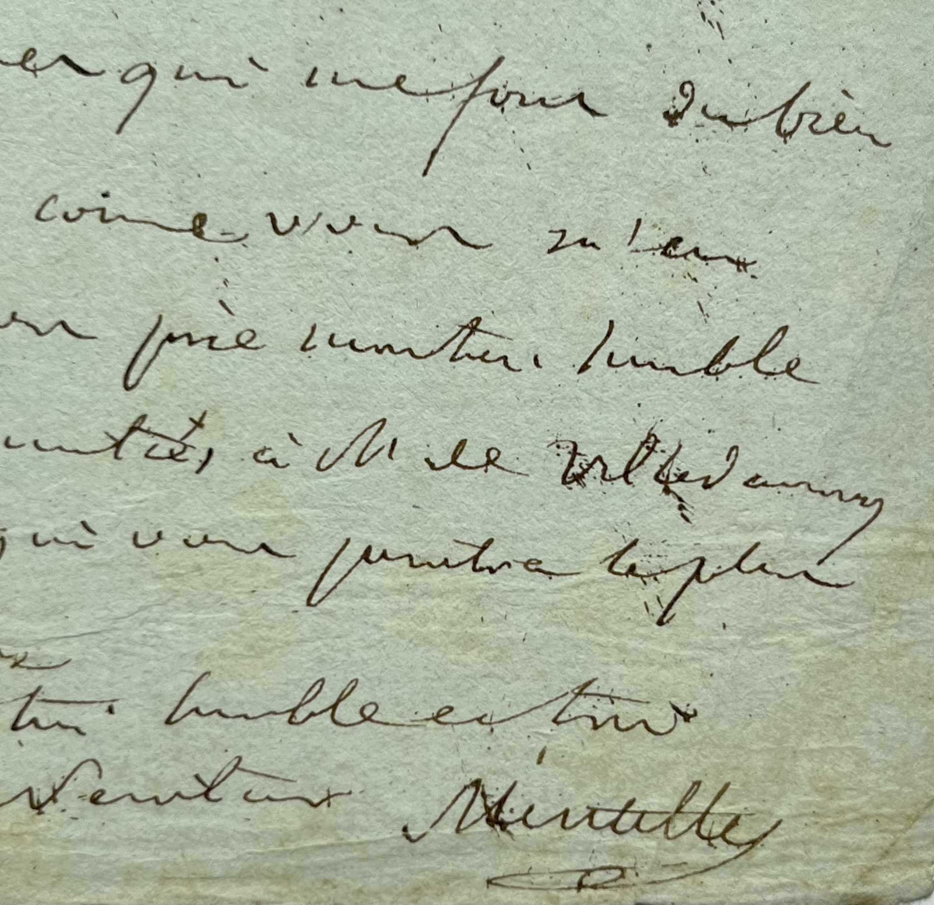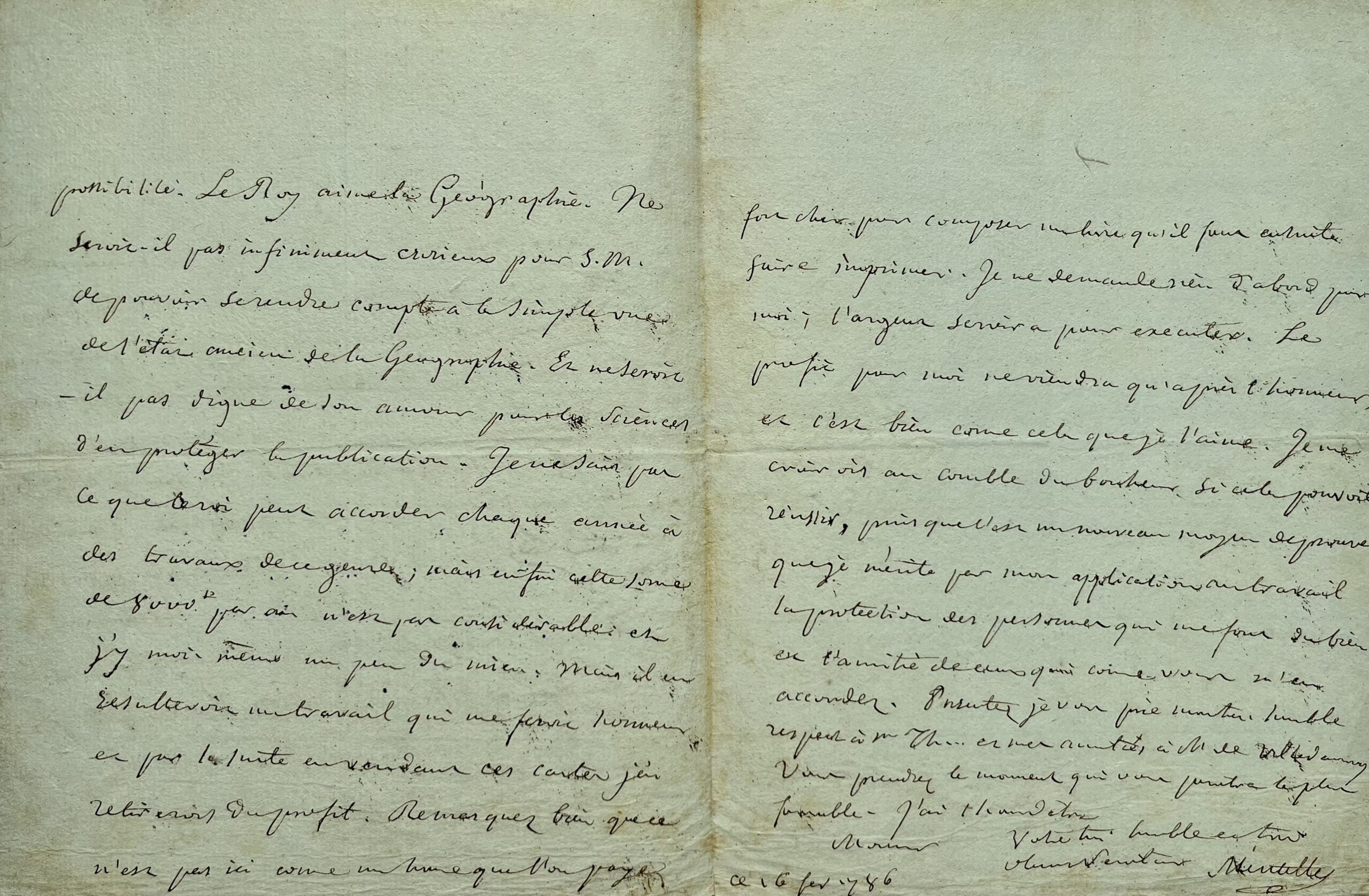 '[...] J'ai imaginé le travail dont je parle dans le Mémoire. Si j'avois là assez de fortune je l'aurois fait d'abord puis je l'aurois montré ensuite. Mais ne le pouvant pas, je voudrois bien pouvoir en obtenir en possibilité. Le Roy aime la Géographie. Ne serait-il pas infiniment curieux pour S. M. de pouvoir se rendre compte à la simple vue de l'état ancien de la Géographie. Et ne serait-il pas digne de son amour pour les sciences d'en protéger la publication. Je ne sais pas ce que le Roi peut accorder chaque année à des travaux de ce genre [...]". Mentelle précise que l'argent ne serait pas pour lui, mais pour réaliser son œuvre, la vente des cartes par la suite lui procurera du profit.