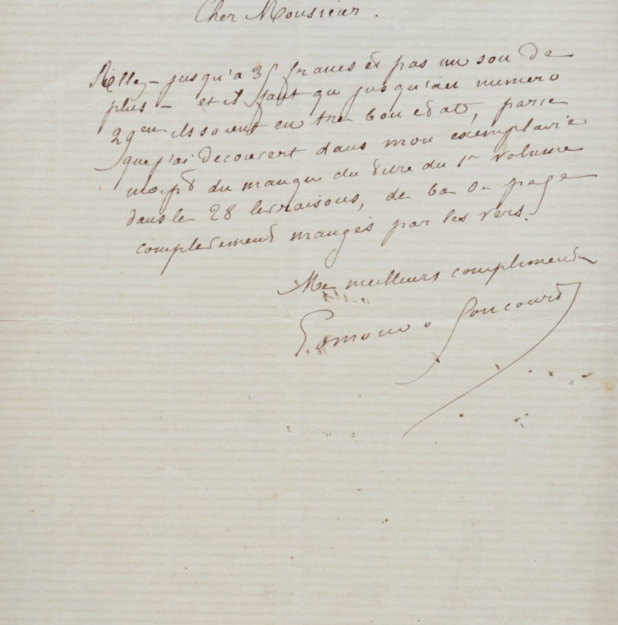 "Allez jusqu'à 35 francs et pas un sou de plus - et il faut que jusqu'au numéro 29ème ils soient en très bon état, parce que j'ai découvert dans mon exemplaire [...] dans les 28 livraisons, des bas de pages complètement mangés par les vers".