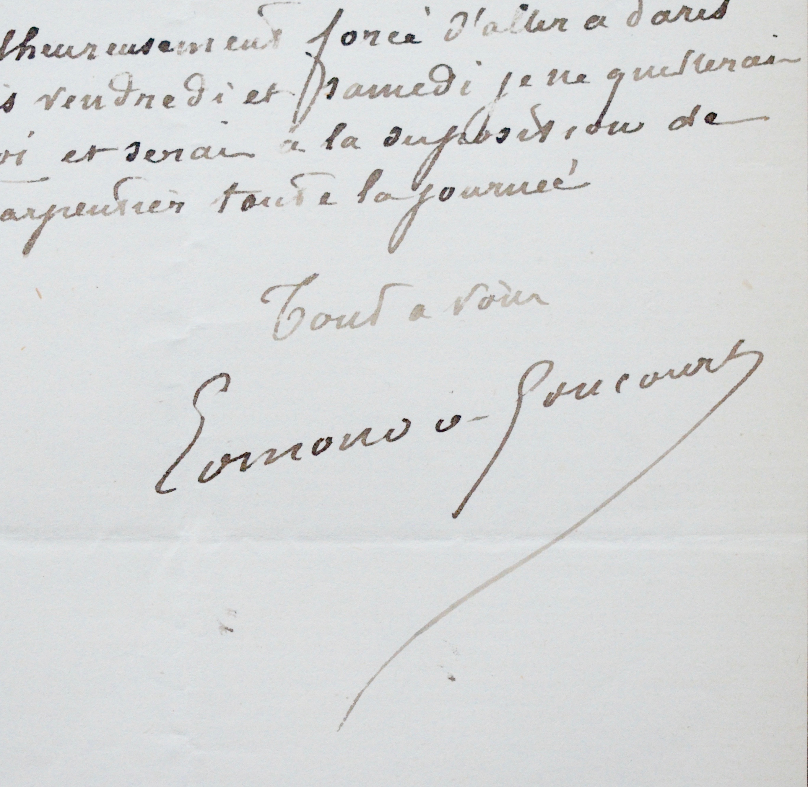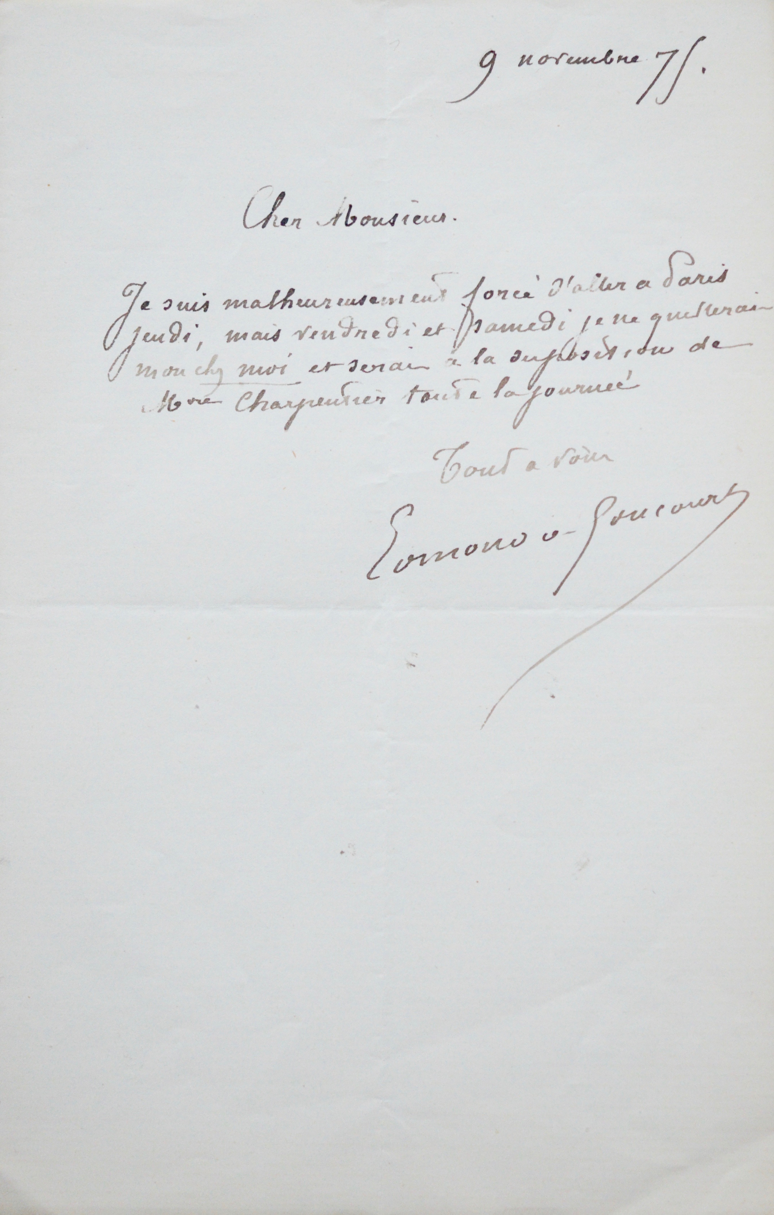 "[...] Je suis malheureusement forcé d'aller à Paris jeudi, mais vendredi et samedi je ne quitterai mon chez moi et serai à la disposition de Mme Charpentier [Marguerite-Louise Lemonnier] toute la journée. Tout à vous, [...]".