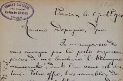 Lettre de remerciements du dramaturge Edmond Duesberg à M. Dopagne, libraire à Spa, pour sa proposition de mettre en vente son dernier opuscule : «Le gain me laisse indifférent mais ce qui me tient à coeur, ce sont les idées que je défends, aussi vous serais-je profondément reconnaissant si vous voulez seconder mes efforts de votre mieux.»