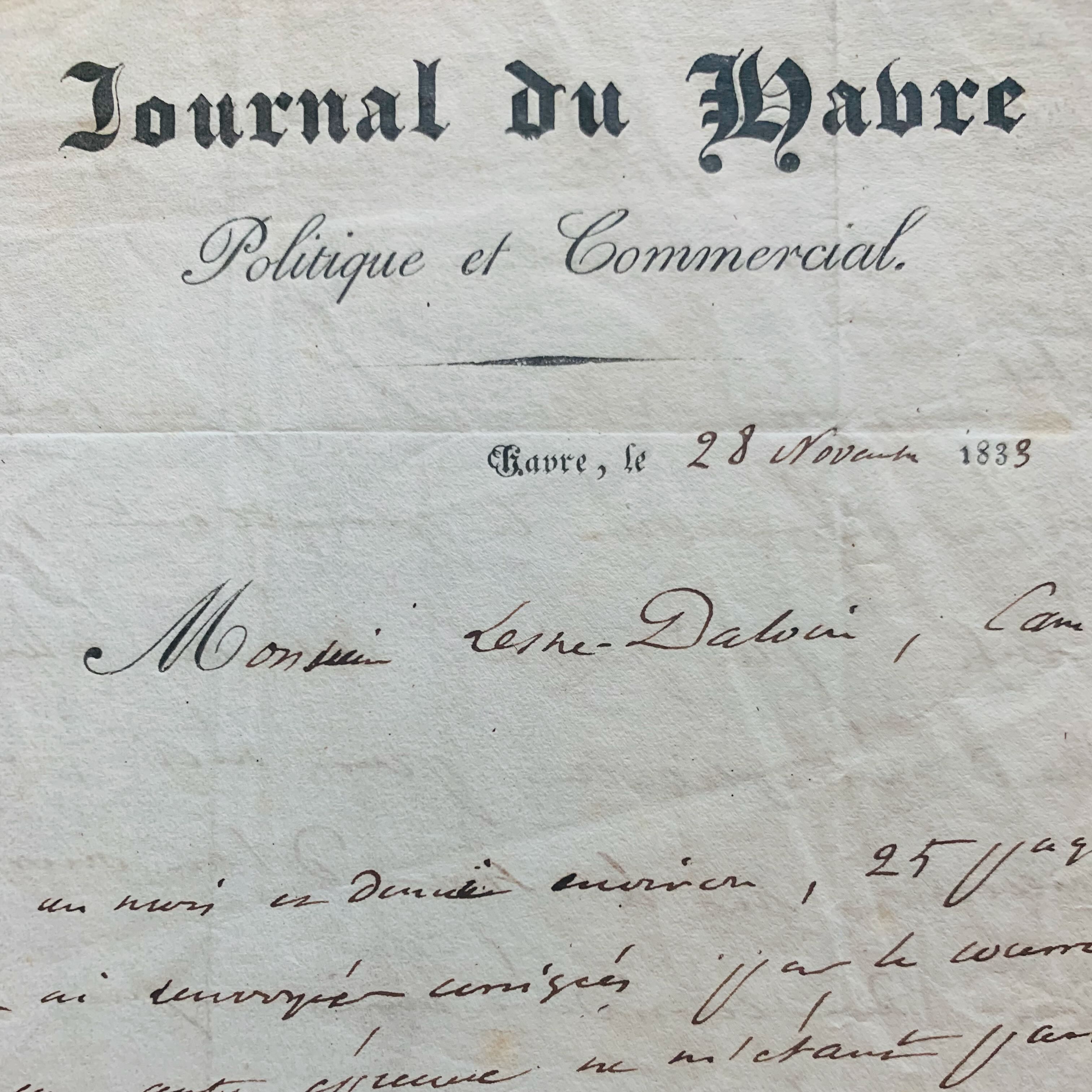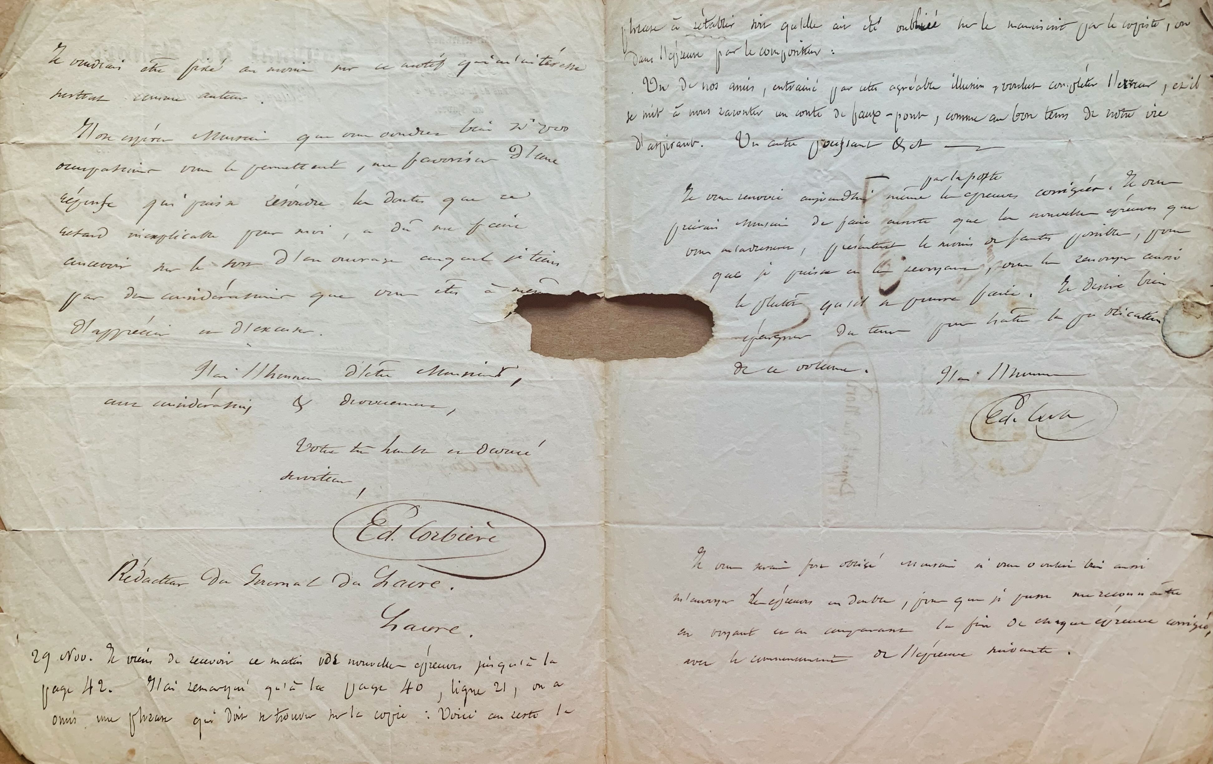 Edouard Corbière (Brest, 1793/1875)Intéressante lettre d'Edouard Corbière à son imprimeur, au sujet de la publication de son nouveau roman maritime, Le Prisonnier de guerre.