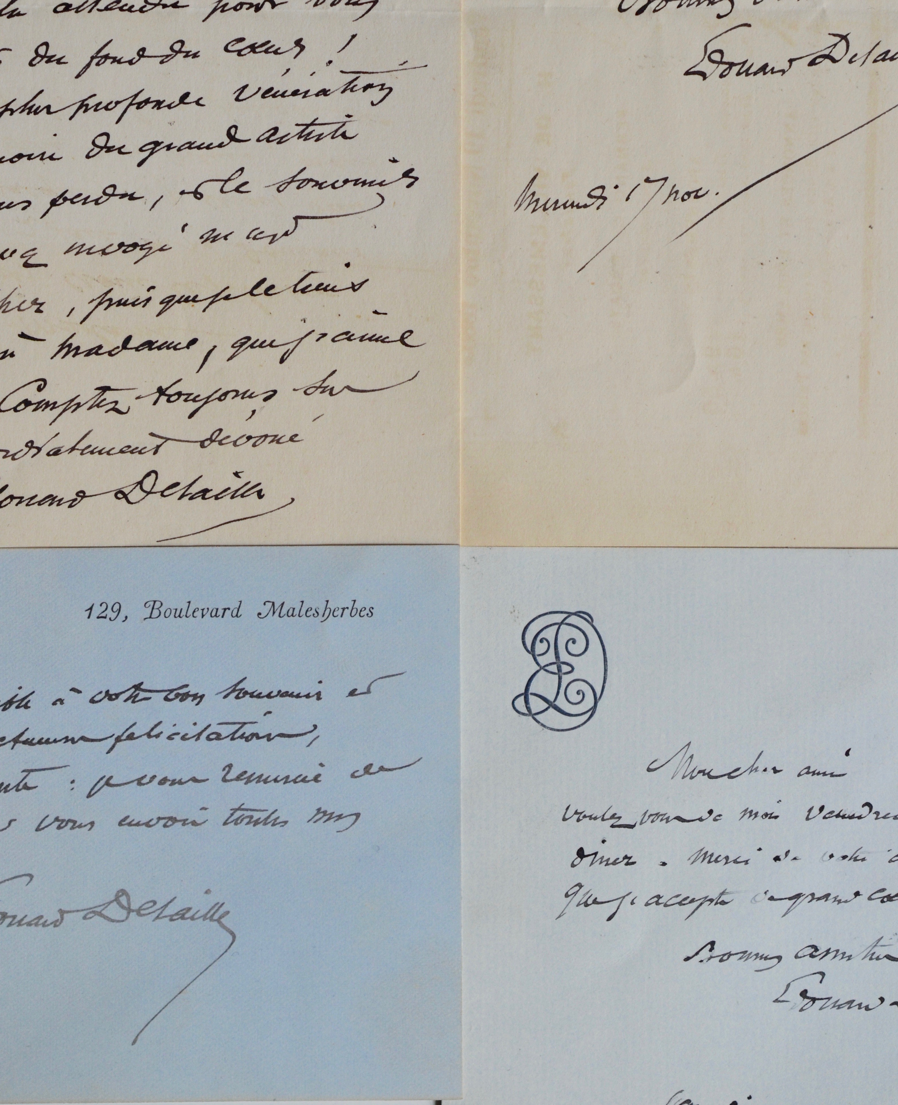 Edouard Detaille (Paris, 1848/1912)Deux lettres et deux cartes autographes signées d'Edouard Detaille.