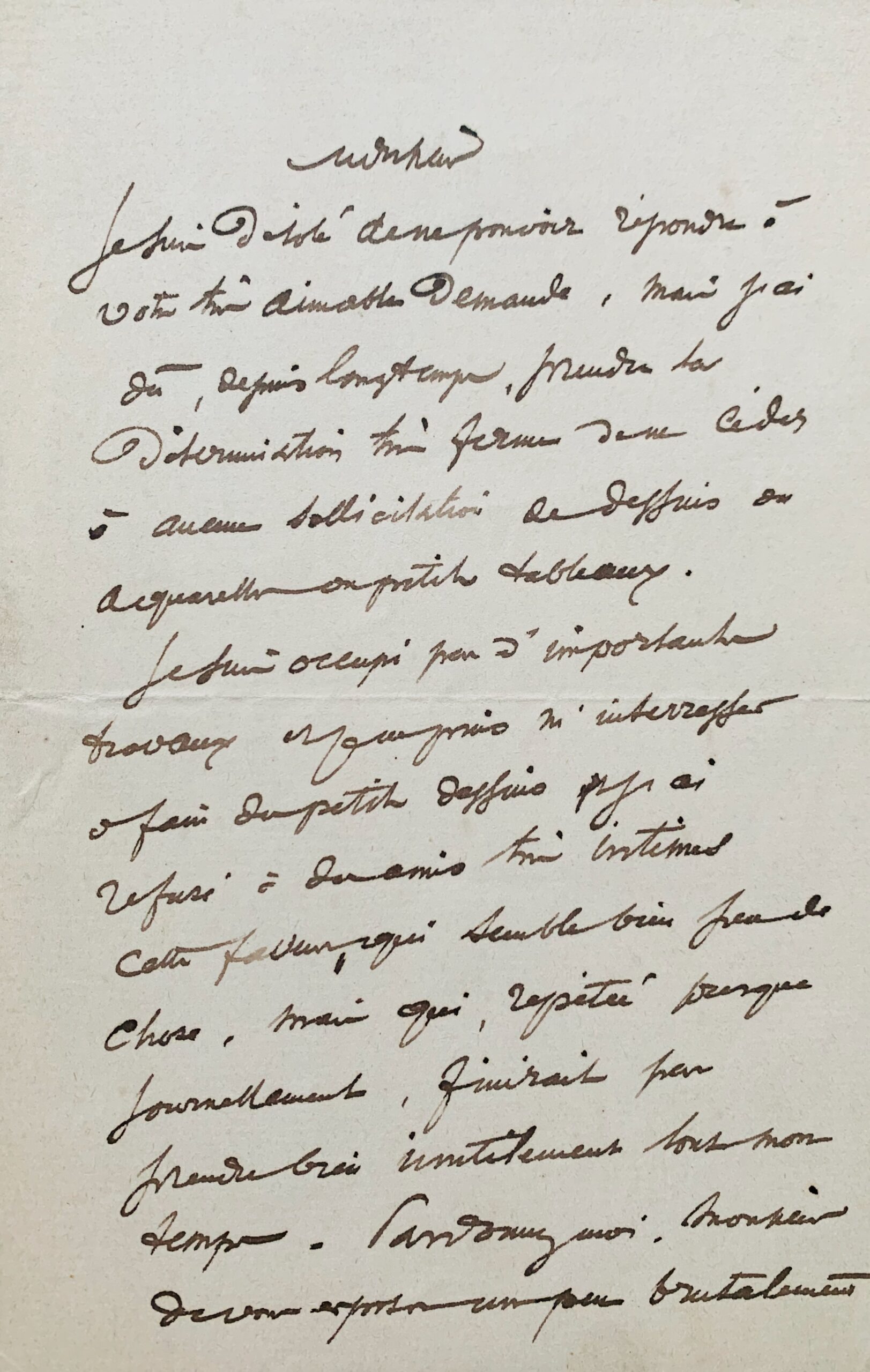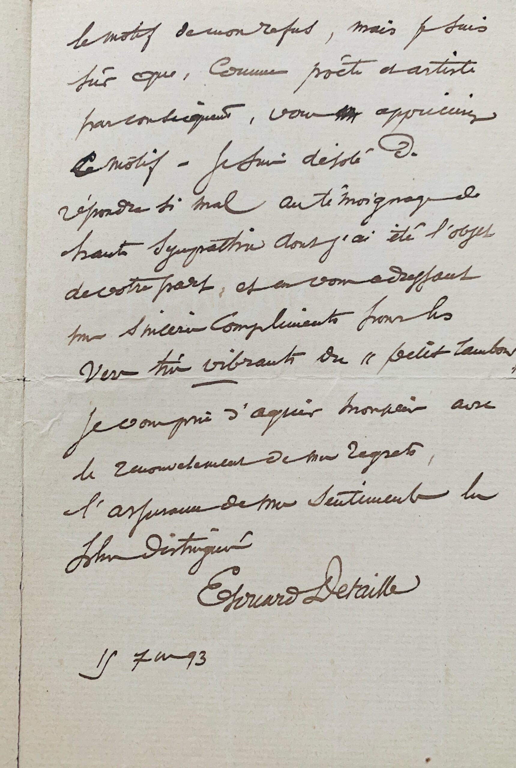 "J'ai dû, depuis longtemps, prendre la détermination ferme de ne céder à aucune sollicitation de dessins ou aquarelles ou petits tableaux. Je suis occupé par d'importants travaux et je ne puis m'intéresser à faire des petits dessins. J'ai refusé à des amis très intimes cette faveur, qui semble bien peu de chose, mais qui, répétée presque journellement, finirait par prendre bien inutilement tout mon temps. Pardonnez-moi, monsieur, de vous exposer un peu brutalement le motif de mon refus, mais je suis sûr que, comme poète et artiste par conséquent, vous apprécierez ce motif. Je suis désolé de répondre si mal au témoignage de haute sympathie dont j'ai été l'objet de votre part, et en vous adressant mes très sincères compliments pour les vers très vibrants du "petit tambour" [...]".