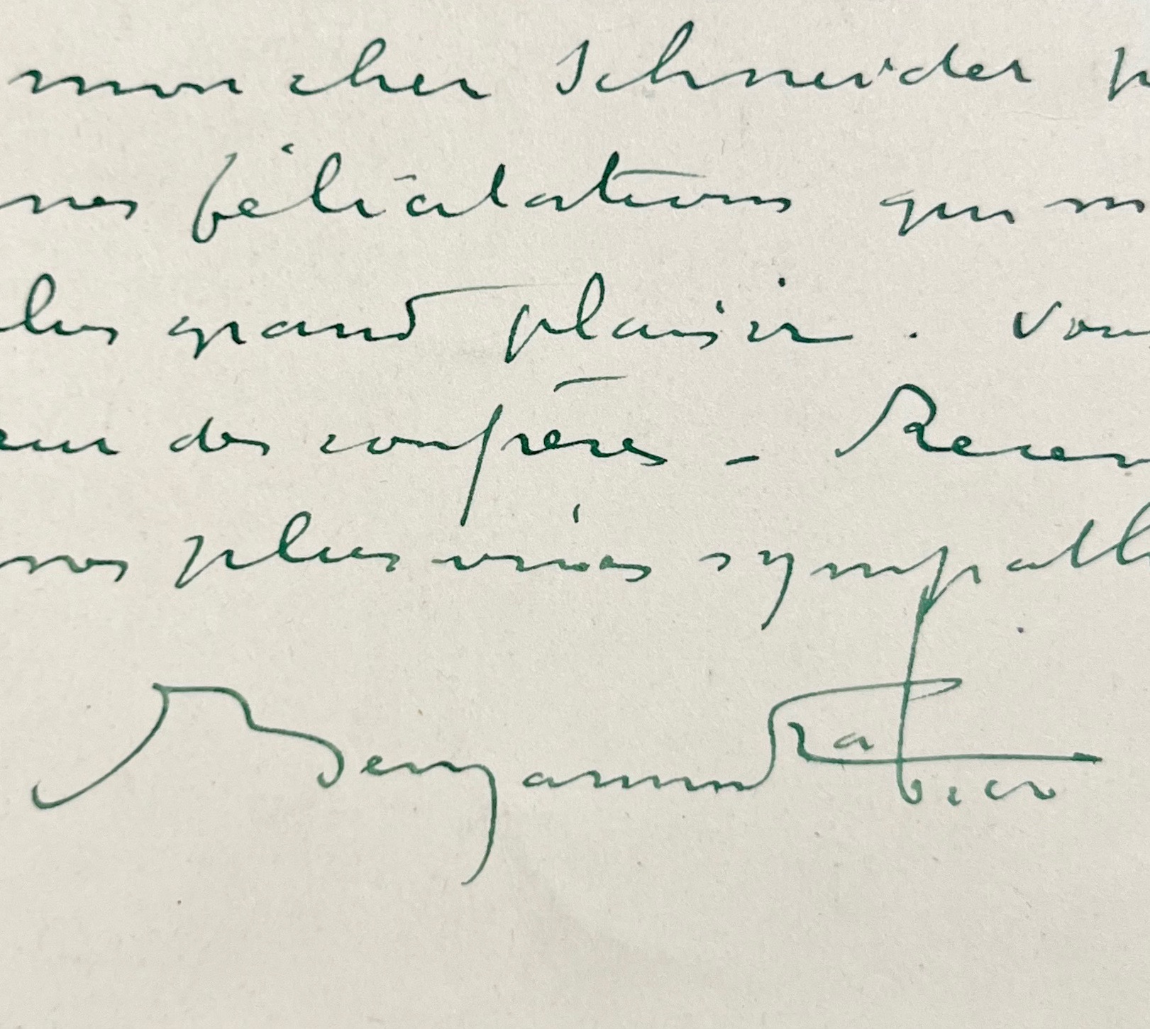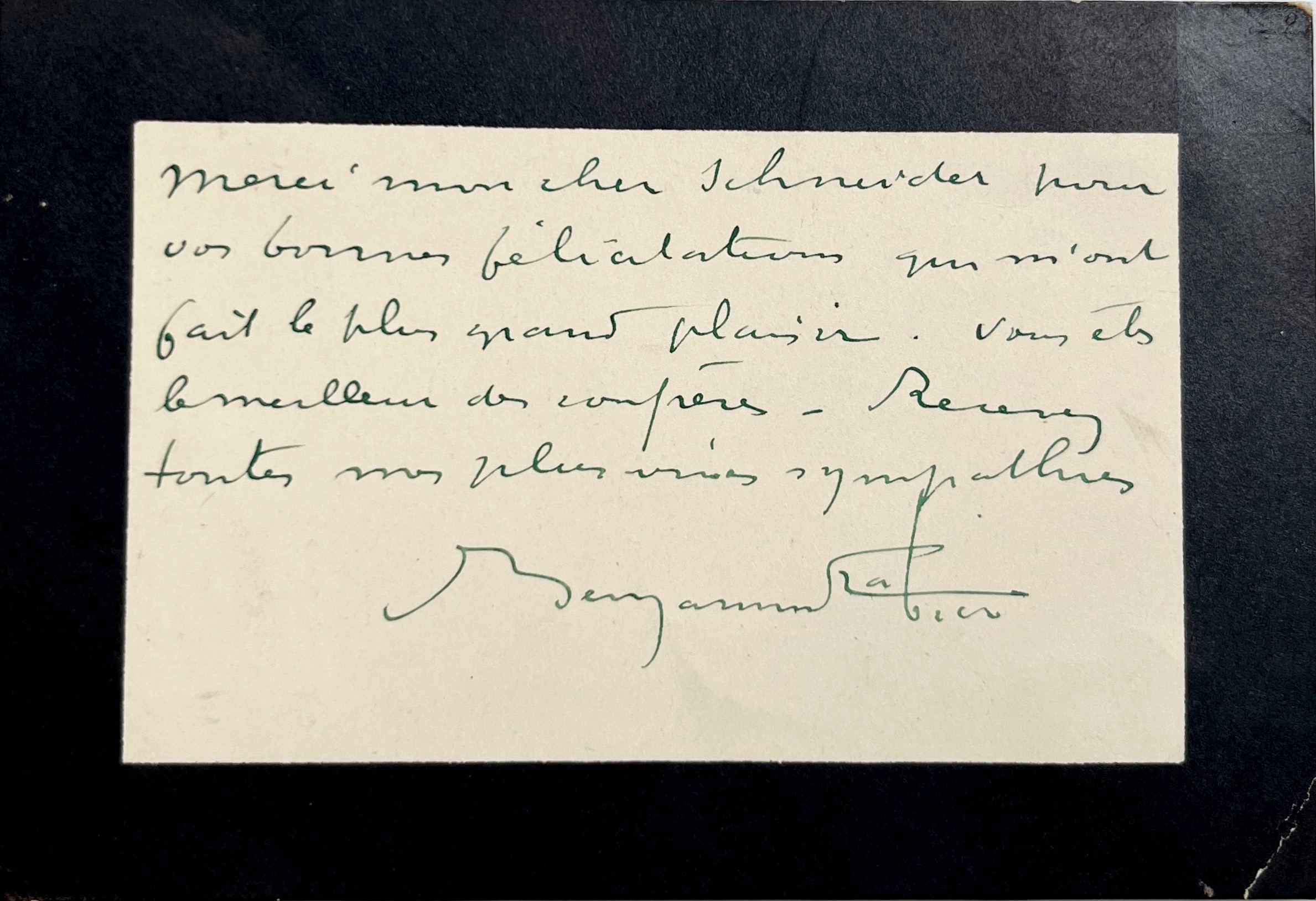 "Merci mon cher Schneider pour vos bonnes félicitations qui m'ont fait le plus grand plaisir. Vous êtes le meilleur des confrères. Recevez toutes mes plus vives sympathies".