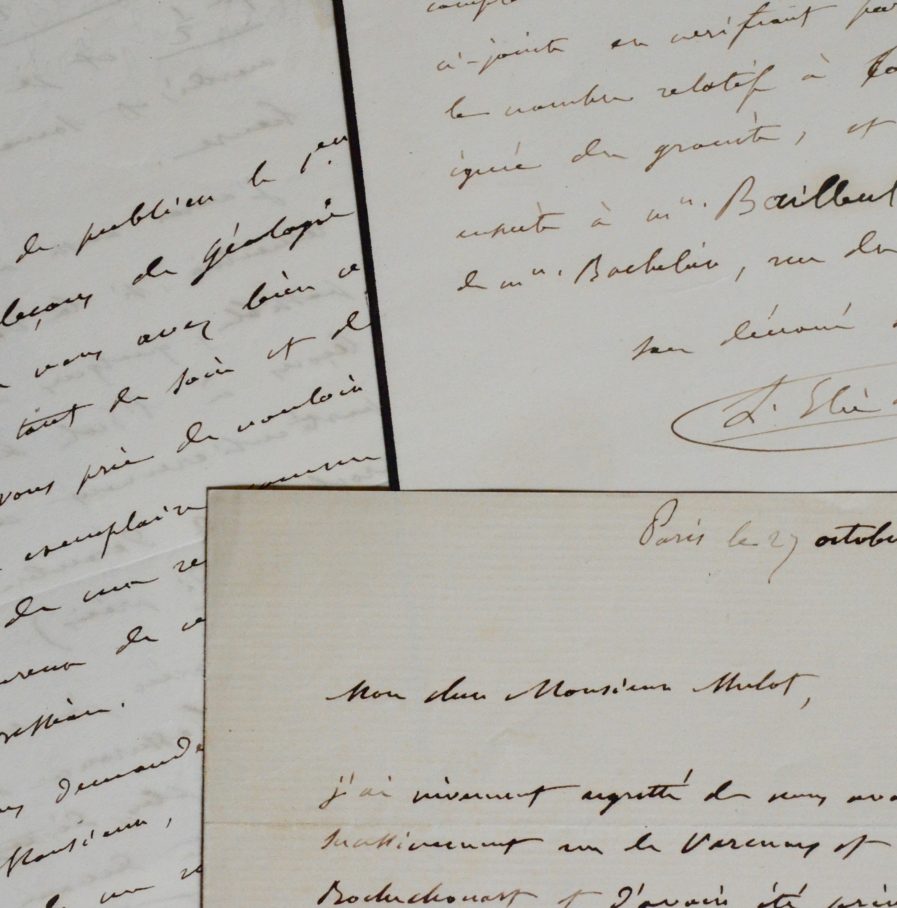 Trois lettres autographes signées du géologue Léonce Élie de Beaumont, adressées à différents correspondants.