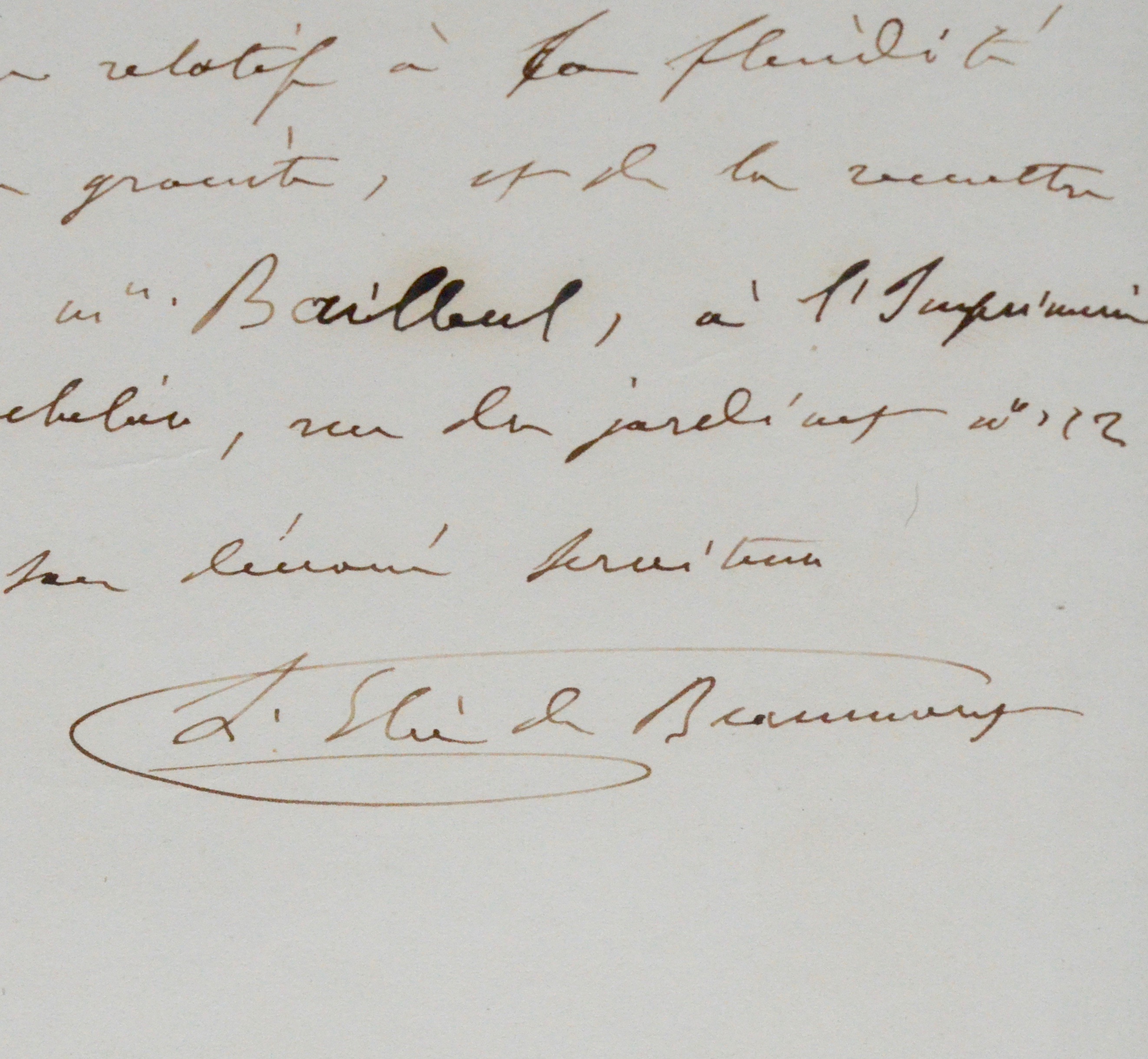Sur la publication de ses Leçons de Géologie (1843-1844), son cours au Collège de France, la correction d’épreuves "en vérifiant particulièrement le nombre relatif à la fluidité ignée du granit" à remettre à l'éditeur Bailleul.