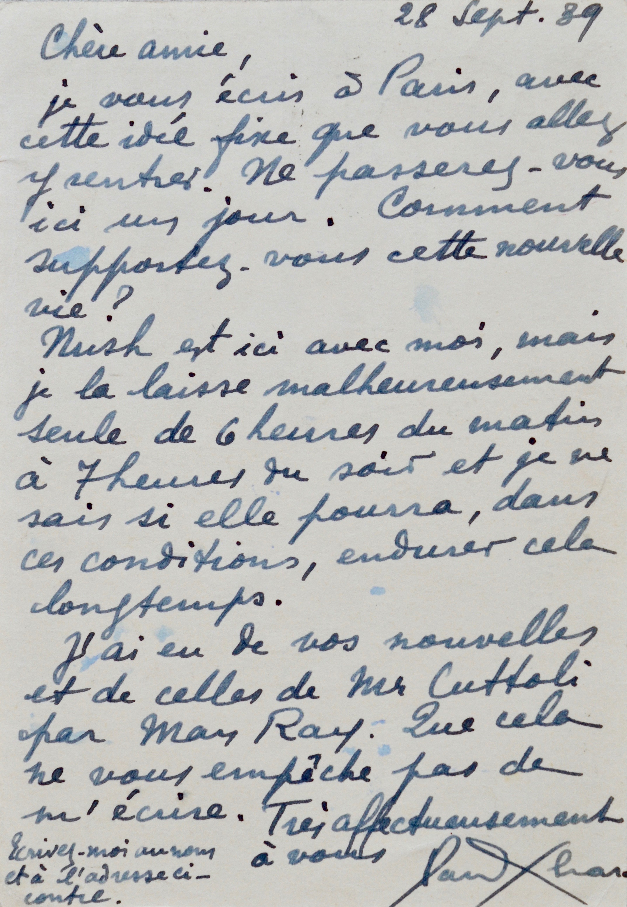 "Je vous écris à Paris, avec cette idée fixe que vous allez y rentrer. Ne passerez-vous ici un jour. Comment supportez-vous cette nouvelle condition? Nush est ici avec moi, mais je la laisse malheureusement seule de 6 heures du matin à 7 heures du soir et je ne sais si elle pourra, dans ces conditions, endurer cela longtemps. J'ai eu de vos nouvelles et de celles de Mr Cuttoli par Man Ray. Que cela ne vous empêche pas de m'écrire".
