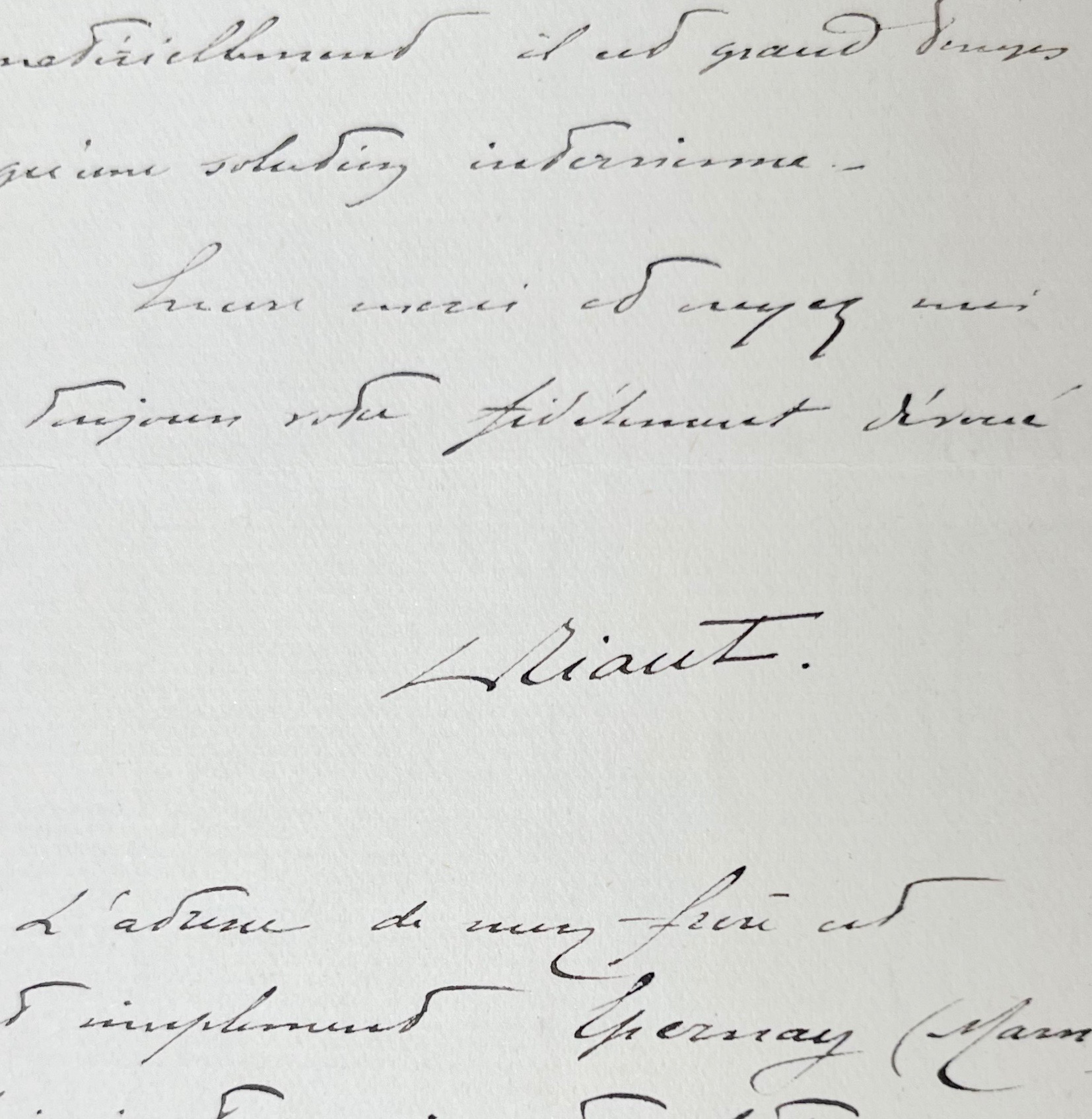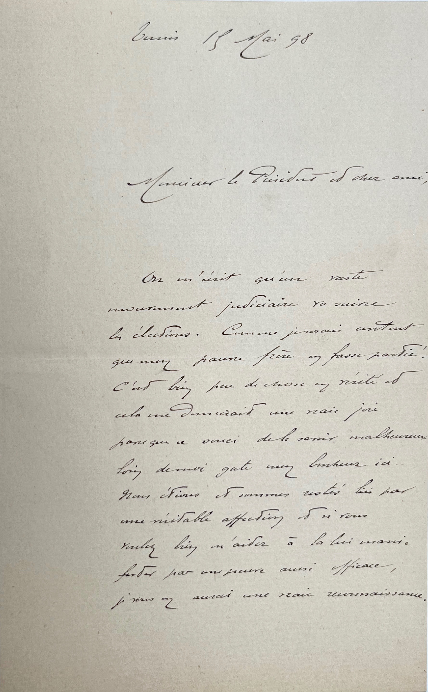 "On m'écrit qu'un vaste mouvement judiciaire va suivre les élections. Comme je serais content que mon pauvre frère [Léon Driant] en fasse partie ! C'est bien peu de chose en vérité et cela me donnerait une vraie joie parce que ce souci de le savoir malheureux loin de moi gâte mon bonheur. Nous étions et sommes restés liés par une véritable affection et si vous voulez bien m'aider à la lui manifester par une preuve aussi efficace, je vous en aurai une vraie reconnaissance [...]".