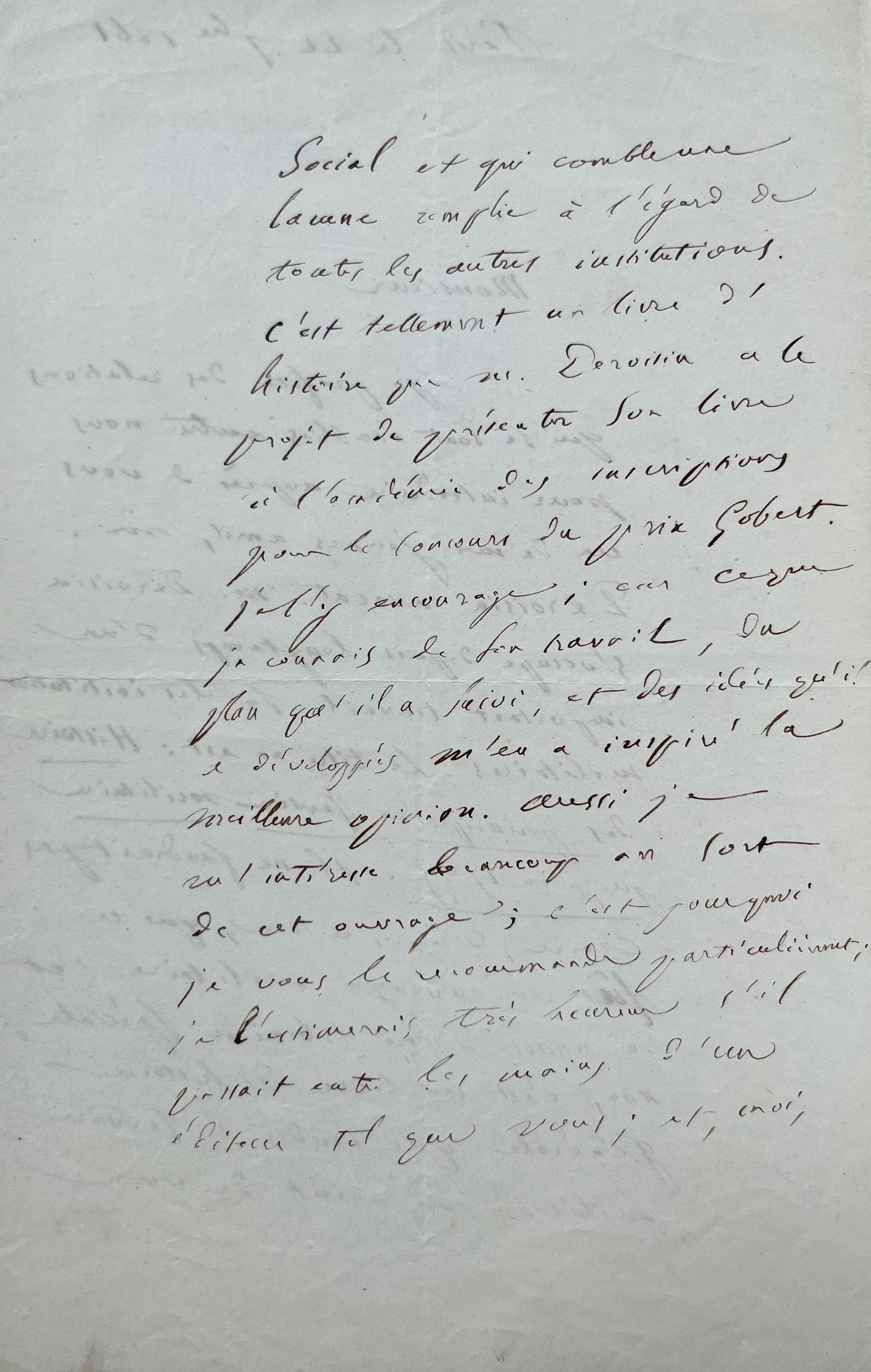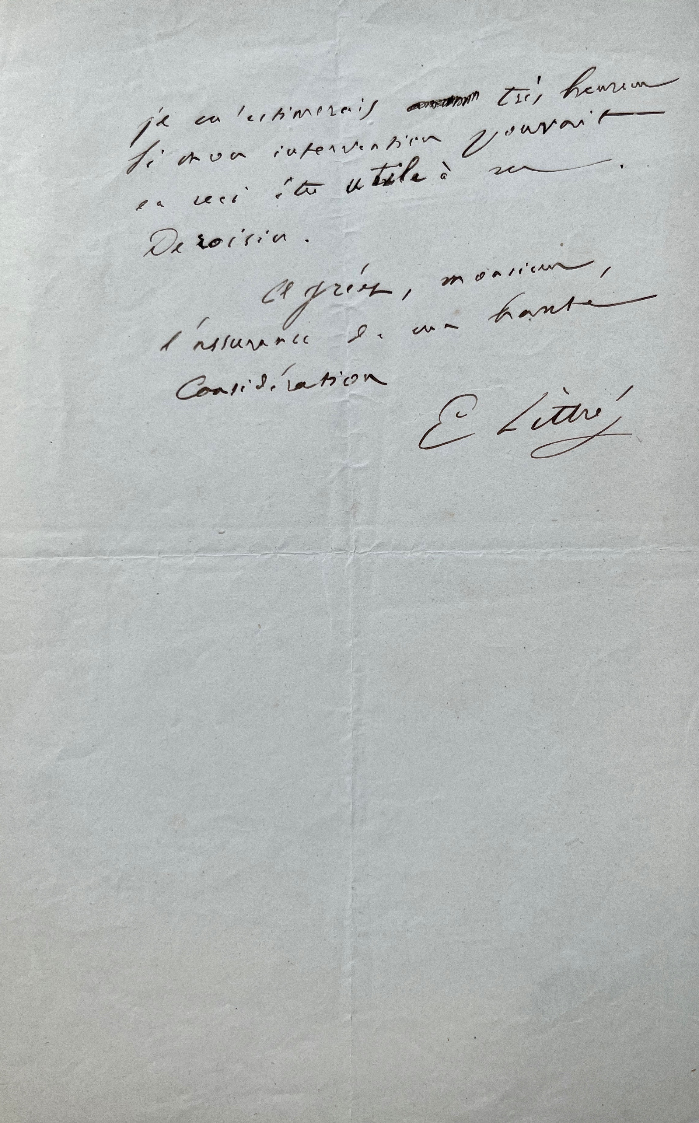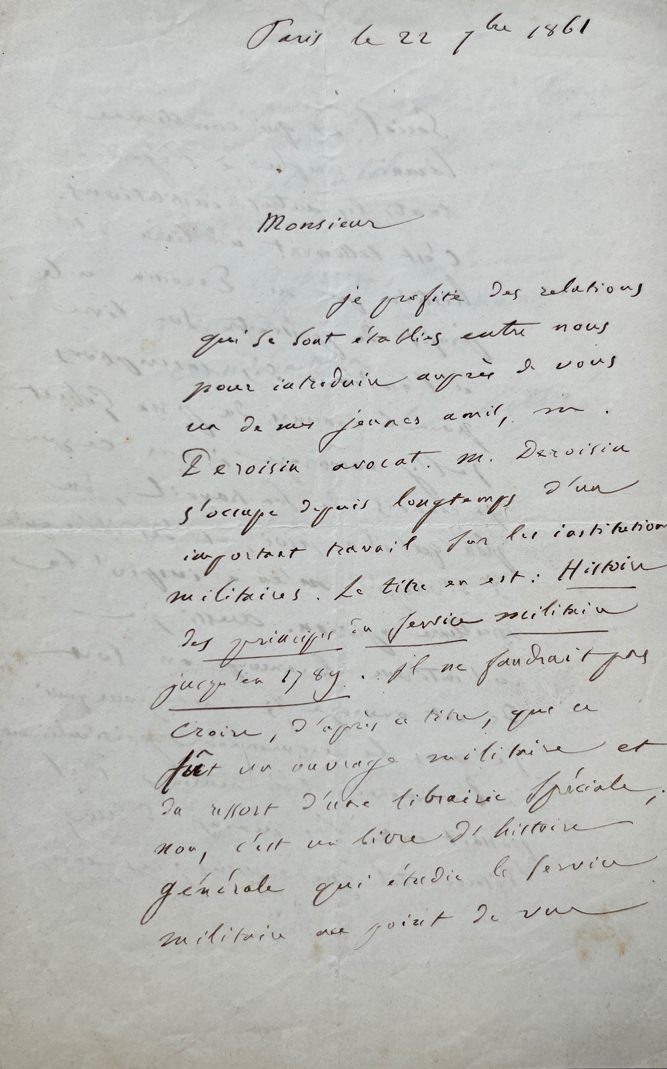 Chaleureuse lettre de recommandation d'Émile Littré au sujet d'un manuscrit de l'avocat Deroisin ayant pour titre Histoire des principes du service militaire jusqu'en 1789 : "[...] c'est un livre d'histoire générale qui étudie le service militaire d'un point de vue social et qui comble une lacune remplie à l'égard de toutes les autres institutions [...]". Littré insiste sur les qualités de l'ouvrage et de l'auteur, etc.
